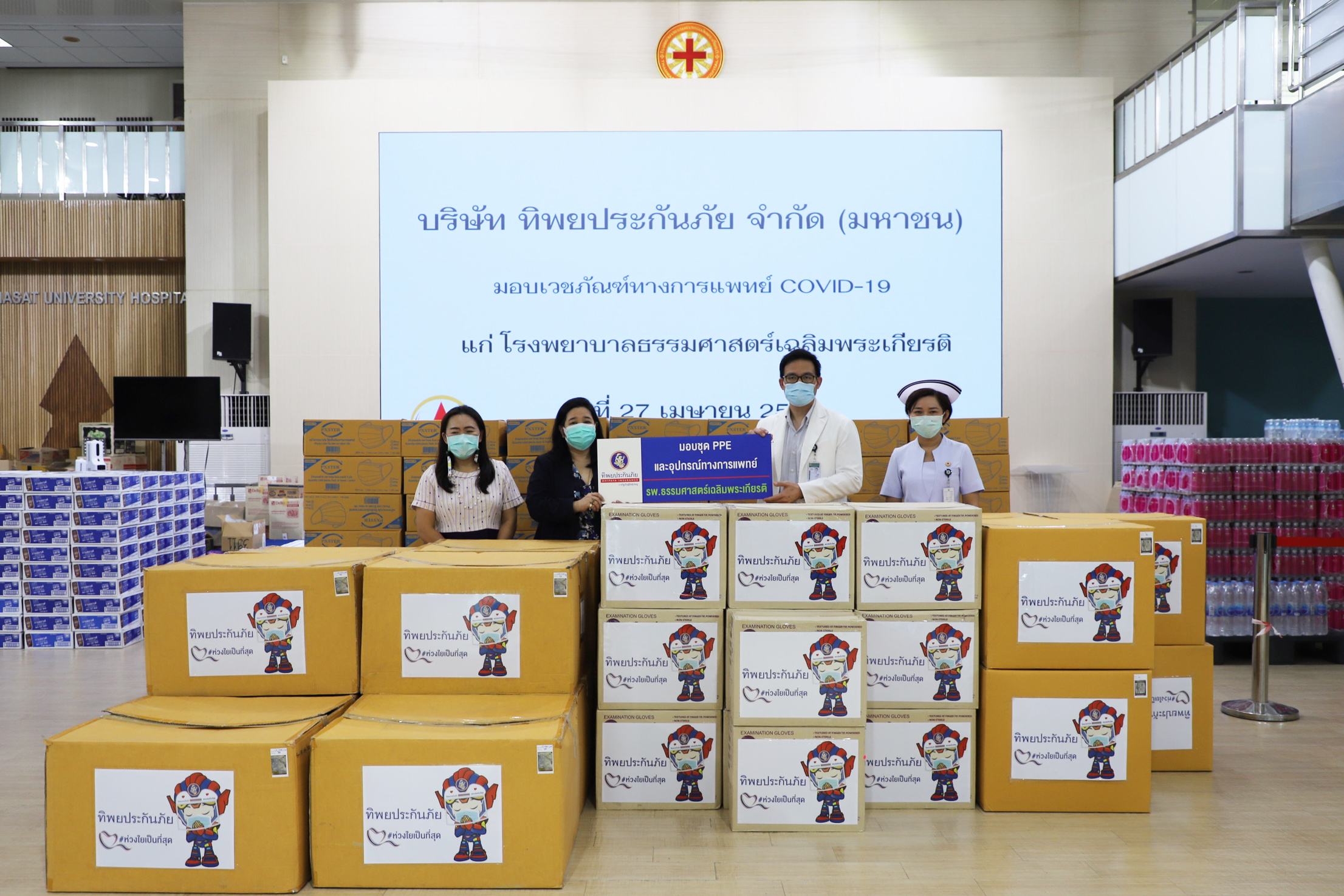 27 เมษายน 2564 : คุณบุญจิรา โสตถิทัต ผู้อำนวยการฝ่ายบริหารทั่วไป ทิพยประกันภัย มอบอุปกรณ์ป้องกันไวรัสโควิด-19 อาทิเช่น ชุด PPE (Personal Protective Equipment) จำนวน 1,000 ชุด ถุงมือยาง จำนวน 20,000 คู่ และหน้ากากอนามัย จำนวน 50,000 ชิ้น ให้แก่แพทย์ พยาบาลและบุคลากรทางการแพทย์ โรงพยาบาลธรรมศาสตร์เฉลิมพระเกียรติ ด้วยความห่วงใยและเพื่อความปลอดภัยจากการติดเชื้อขณะปฏิบัติหน้าที่ดูแลรักษาผู้ป่วยโควิด-19 โดยมี ผศ.นพ.ปรีดิ์ นิมนานนิตย์ ผู้ช่วยผู้อำนวยการฝ่ายวางแผนและงบประมาณ รพ.ธรรมศาสตร์เฉลิมพระเกียรติ รับมอบ ณ อาคารหม่อมราชวงษ์สุวพันธ์ ชั้น 1 รพ.ธรรมศาสตร์เฉลิมพระเกียรติ![]()