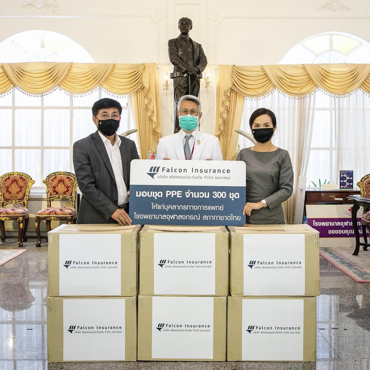 28 เมษายน 2564 : ด้วยความห่วงใยบุคลากรทางการแพทย์และเจ้าหน้าที่ที่ต้องปฎิบัติหน้าที่ดูแลผู้ป่วยโควิด-19 ซึ่งมีจำนวนผู้ป่วยสะสมเพิ่มขึ้นอย่างต่อเนื่องจากการระบาดระลอกใหม่ และบุคลากรทางการแพทย์ติดเชื้อโควิด-19 เพิ่มขึ้นต่อเนื่องจากการปฏิบัติหน้าที่ คุณโสภา กาญจนรินทร์ ประธานเจ้าหน้าที่บริหาร บริษัท ฟอลคอนประกันภัย จำกัด (มหาชน) และคุณอำนาจ มาตรง ที่ปรึกษากฎหมายและกำกับดูแลองค์กร เป็นตัวแทน มอบชุด PPE จำนวน 300 ชุด ให้แก่โรงพยาบาลจุฬาลงกรณ์