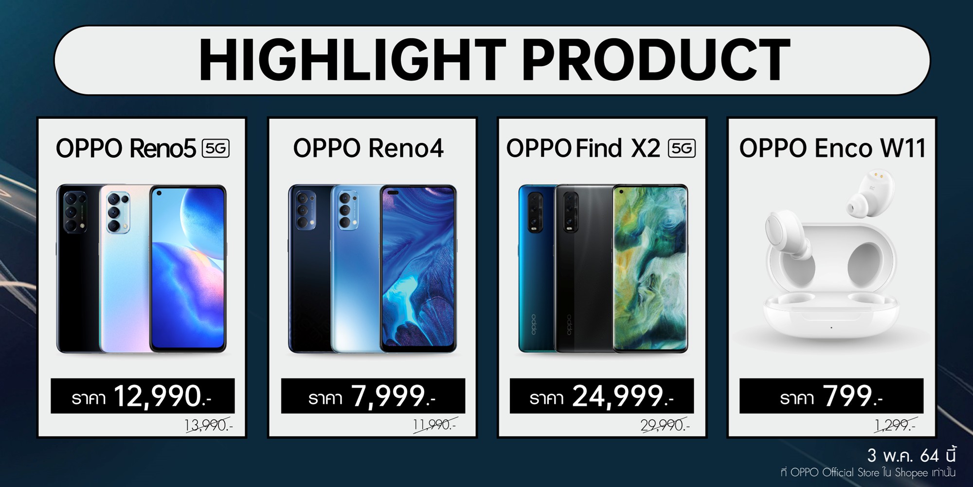 - Flash Voucher แจกคูปองพิเศษตามช่วงเวลาที่กำหนด เฉพาะเวลา 0:00, 9:00,11:00, 15:00, 18:00 และ 21:00 ของวันที่ 3 พฤษภาคม 2564 แจกคูปองส่วนลด 1,100 บาท เมื่อซื้อขั้นต่ำ 8,999 บาท และเฉพาะเวลาเที่ยงคืนของวันที่ 3 พฤษภาคม 2564 แจกคูปองส่วนลด 500 บาท เมื่อซื้อขั้นต่ำ 1,000 บาท เฉพาะสินค้าที่ร่วมรายการภายใน OPPO Official Store และใช้คูปองได้เฉพาะวันที่ 3 พฤษภาคม 2564 โดยคูปองมีจำนวนจำกัด