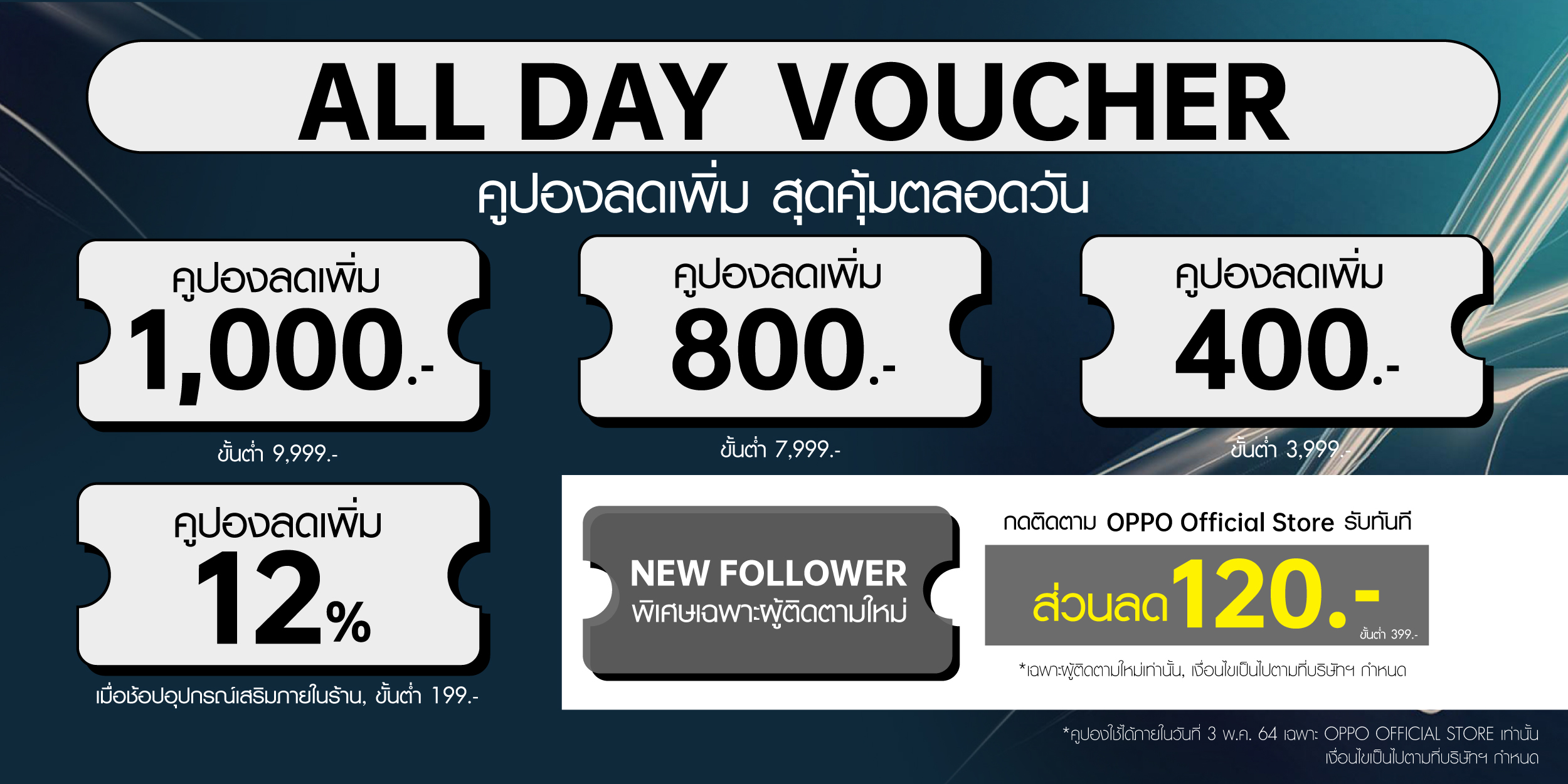 - Follow us! Voucher คูปองพิเศษเมื่อติดตาม OPPO Official Store ตั้งแต่วันที่ 27 เมษายน 2564 รับฟรี! คูปองส่วนลด 120 บาท เมื่อซื้อขั้นต่ำ 399 บาท โดยสามารถใช้คูปองได้เฉพาะวันที่3 พฤษภาคม 2564 เท่านั้น