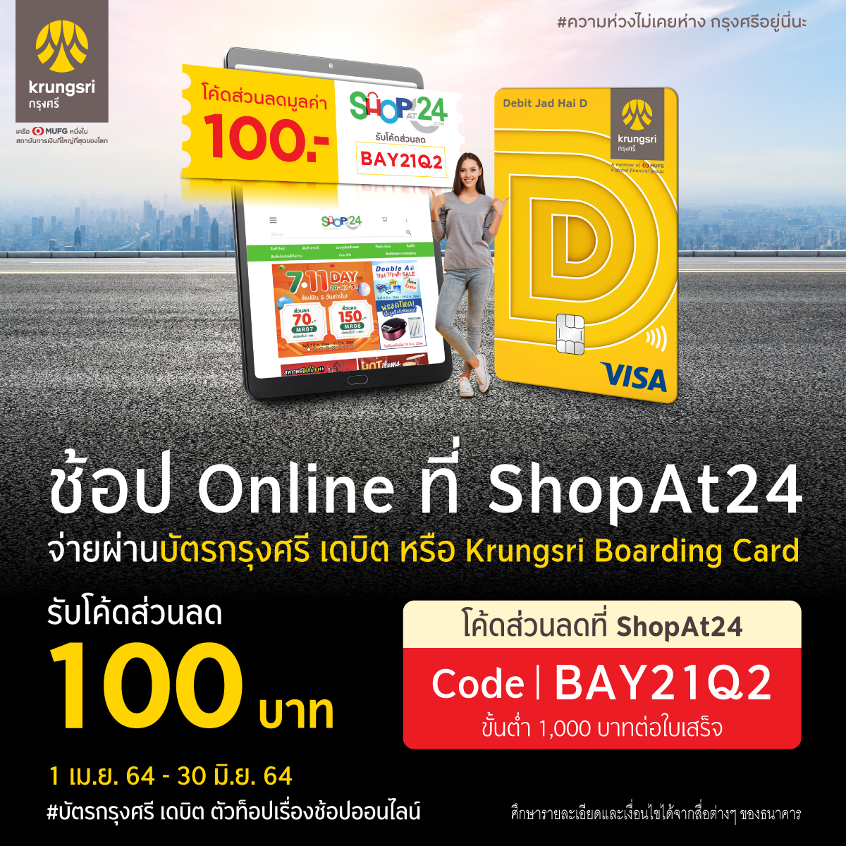 30 เมษายน 2564 : กรุงศรี (ธนาคารกรุงศรีอยุธยา จำกัด (มหาชน)) เอาใจนักช้อปออนไลน์ มอบโค้ดส่วนลด 100 บาท เมื่อช้อปออนไลน์ที่ร้าน ShopAt24 ผ่านบัตรกรุงศรี เดบิต ทุกประเภท และ Krungsri Boarding Card โดยลูกค้าสามารถใช้โค้ด BAY21Q2 เพื่อรับส่วนลดที่แอปพลิเคชัน ShopAt24 หรือ www.ShopAt24.com จำกัด 1 สิทธิ์/หมายเลขบัตร/เดือน สำหรับใช้จ่ายขั้นต่ำ 1,000 บาทต่อใบเสร็จ ตั้งแต่วันนี้ – 30 มิถุนายน 2564 โดยโค้ดส่วนลดจำกัด 1,000 สิทธิ์/เดือน รวมจำกัด 3,000 สิทธิ์ตลอดระยะเวลาส่งเสริมการขาย ติดตามรายละเอียดเพิ่มเติมได้ที่ www.krungsri.com ![]()
