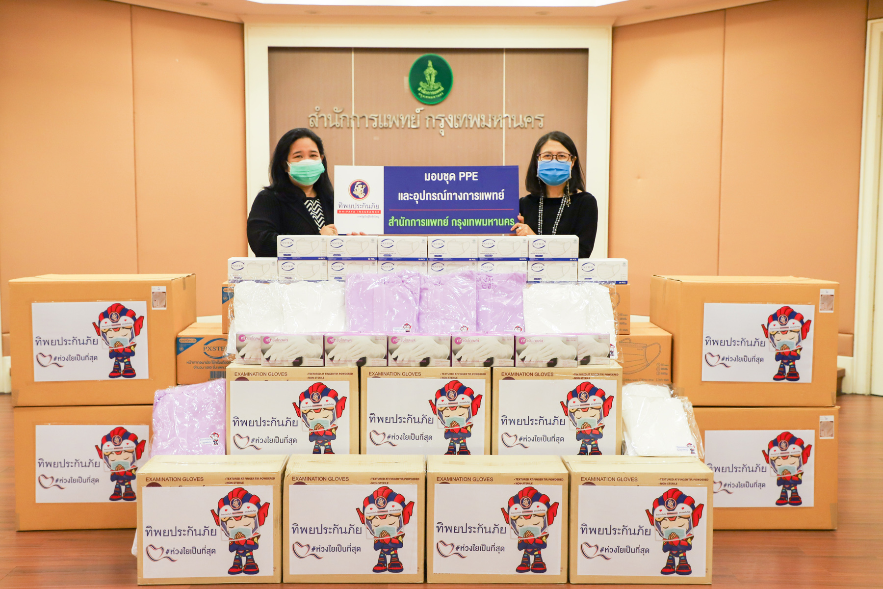 30 เมษายน 2564 : คุณบุญจิรา โสตถิทัต ผู้อำนวยการฝ่ายบริหารทั่วไป ทิพยประกันภัย มอบชุด PPE (Personal Protective Equipment) พร้อมด้วยชุดอุปกรณ์ป้องกันเพื่อความปลอดภัยส่วนบุคคล เช่น หน้ากากอนามัย ถุงมือยาง ให้กับ แพทย์หญิงสุภาพร กรลักษณ์ รองผู้อำนวยการสำนักการแพทย์ ณ สำนักการแพ