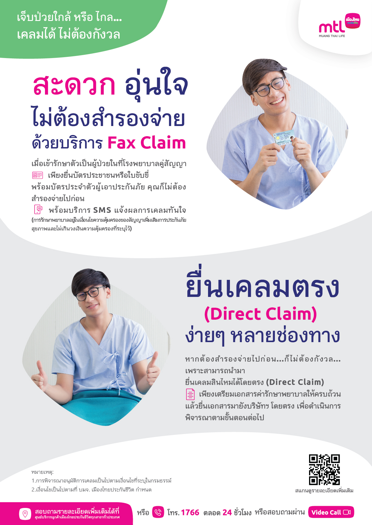 หรือแม้ลูกค้าที่เข้ารับการรักษาและต้องสำรองจ่ายไปก่อนก็คลายกังวลได้ เพราะสามารถมายื่นเคลมตรง หรือ Direct Claim กับบริษัทฯ ได้ง่ายผ่านหลากหลายช่องทาง เพียงลูกค้าเตรียมเอกสารค่ารักษาพยาบาลให้ครบถ้วน เพื่อบริษัทฯ จะได้ดำเนินการพิจารณาตามขั้นตอน และพิเศษสุดกับบริการตรวจสอบสถานะและประวัติการเคลมผ่านเมนู สถานะการเคลม ในแอปพลิเคชัน MTL Click (ทั้งนี้ มูลค่าการเคลมสินไหมผ่านแอปพลิเคชัน MTL Click ขึ้นอยู่กับแต่ละประเภทการเคลม และเป็นไปตามเงื่อนไขที่บริษัทฯ กำหนด) สามารถตรวจสอบรายละเอียดเพิ่มเติมได้ที่ www.muangthai.co.th