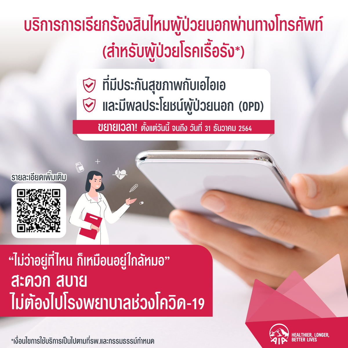 เอไอเอ ประเทศไทย มีความห่วงใยอย่างยิ่ง จึงได้ร่วมมือกับโรงพยาบาลในเครือข่าย ทั้งสิ้น 46 โรงพยาบาล ในการให้บริการผู้ป่วยโรคเรื้อรัง* ที่มีประกันสุขภาพกับเอไอเอ ซึ่งจำเป็นต้องได้รับยาตามคำสั่งการรักษาของแพทย์ ผ่านบริการการเรียกร้องสินไหมผู้ป่วยนอกผ่านทางโทรศัพท์ (Telemedicine) และ/หรือการโทรทางไกลผ่านระบบวิดีโอ (Video Call) โดยสามารถเรียกร้องสินไหมผู้ป่วยนอกได้เสมือนการไปพบแพทย์ที่โรงพยาบาล เพื่อเป็นการให้ความช่วยเหลือ อำนวยความสะดวก และลดความเสี่ยงจากการเดินทางมายังโรงพยาบาลให้แก่ผู้เอาประกันภัยในช่วงสถานการณ์การแพร่ระบาดดังกล่าว