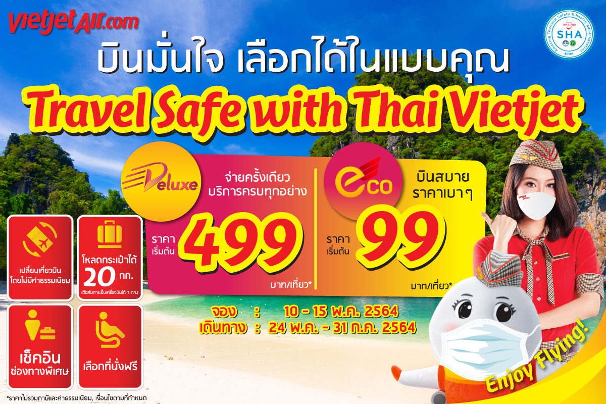 กรุงเทพฯ, 10 พฤษภาคม 2564 : สายการบินไทยเวียตเจ็ท เปิดตัวโปรโมชั่น “Travel Safe with Thai Vietjet บินมั่นใจ เลือกได้ในแบบคุณ” เสนอตั๋วโดยสารราคาพิเศษ ได้แก่ ตั๋วโดยสารชั้นประหยัด ราคาเริ่มต้นเพียง 99 บาท และตั๋วโดยสารแบบดีลักซ์ (Deluxe) ราคาเริ่มต้นเพียง 499 บาท (ราคาไม่รวมภาษี ค่าธรรมเนียม และบริการเสริมพิเศษ) สำหรับเดินทางในทุกเส้นทางบินภายในประเทศของสายการบินฯ ตั๋วโดยสารแบบดีลักซ์ราคาพิเศษนี้รวมน้ำหนักกระเป๋าสัมภาระเช็คอินฟรี 20 กิโลกรัม สิทธิในการเลือกที่นั่งได้ฟรี ช่องทางพิเศษสำหรับเช็คอิน และสิทธิในการเปลี่ยนเที่ยวบินได้ไม่จำกัดจำนวนครั้งโดยไม่เสียค่าธรรมเนียม ผู้โดยสารสามารถจองได้ตั้งแต่วันที่ 10 – 15 พฤษภาคม 2564 เดินทางตั้งแต่ 24 พฤษภาคม – 31 กรกฎาคม 2564 (ยกเว้นวันหยุดนักขัตฤกษ์) ที่ www.vietjetair.com