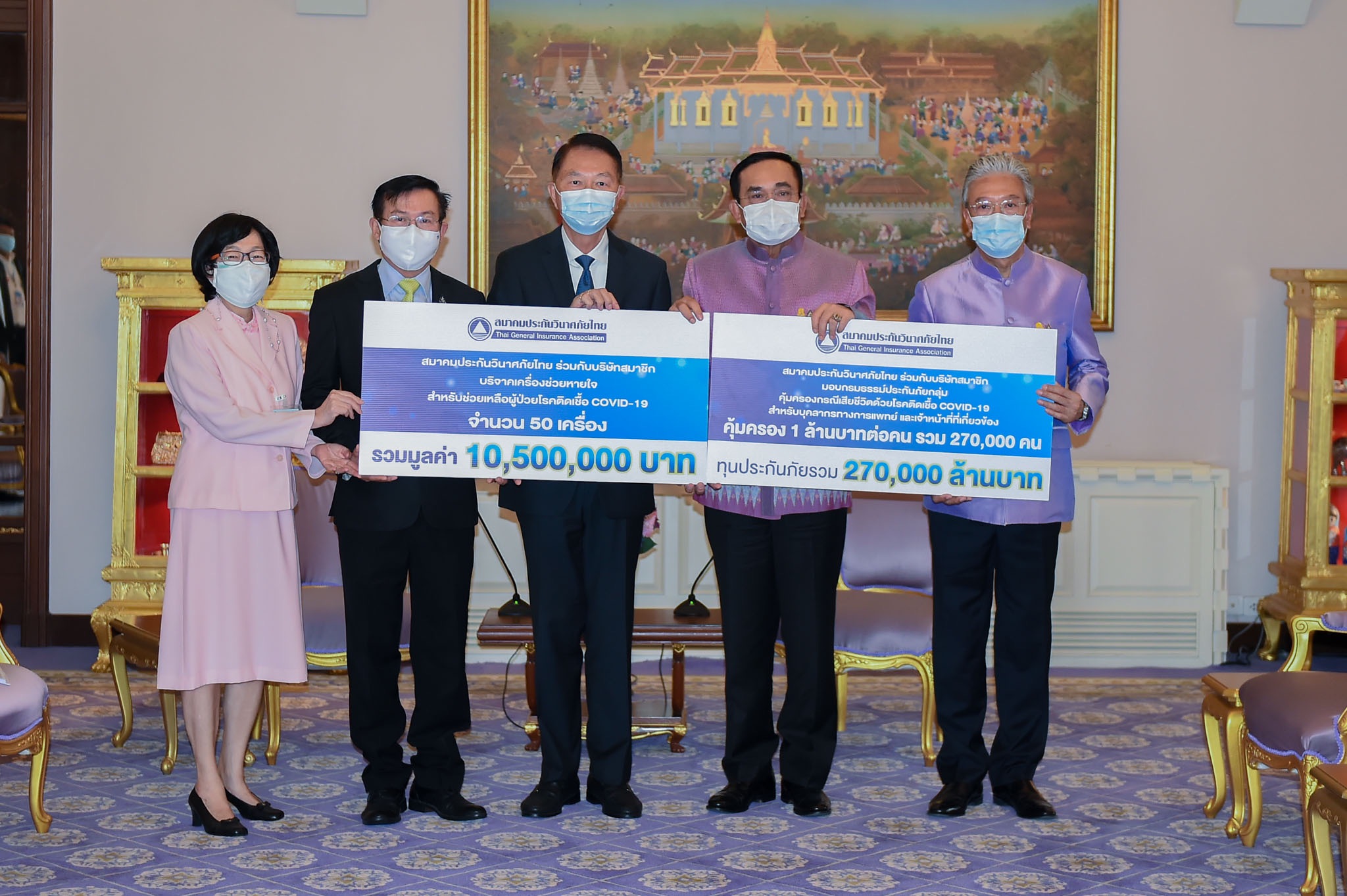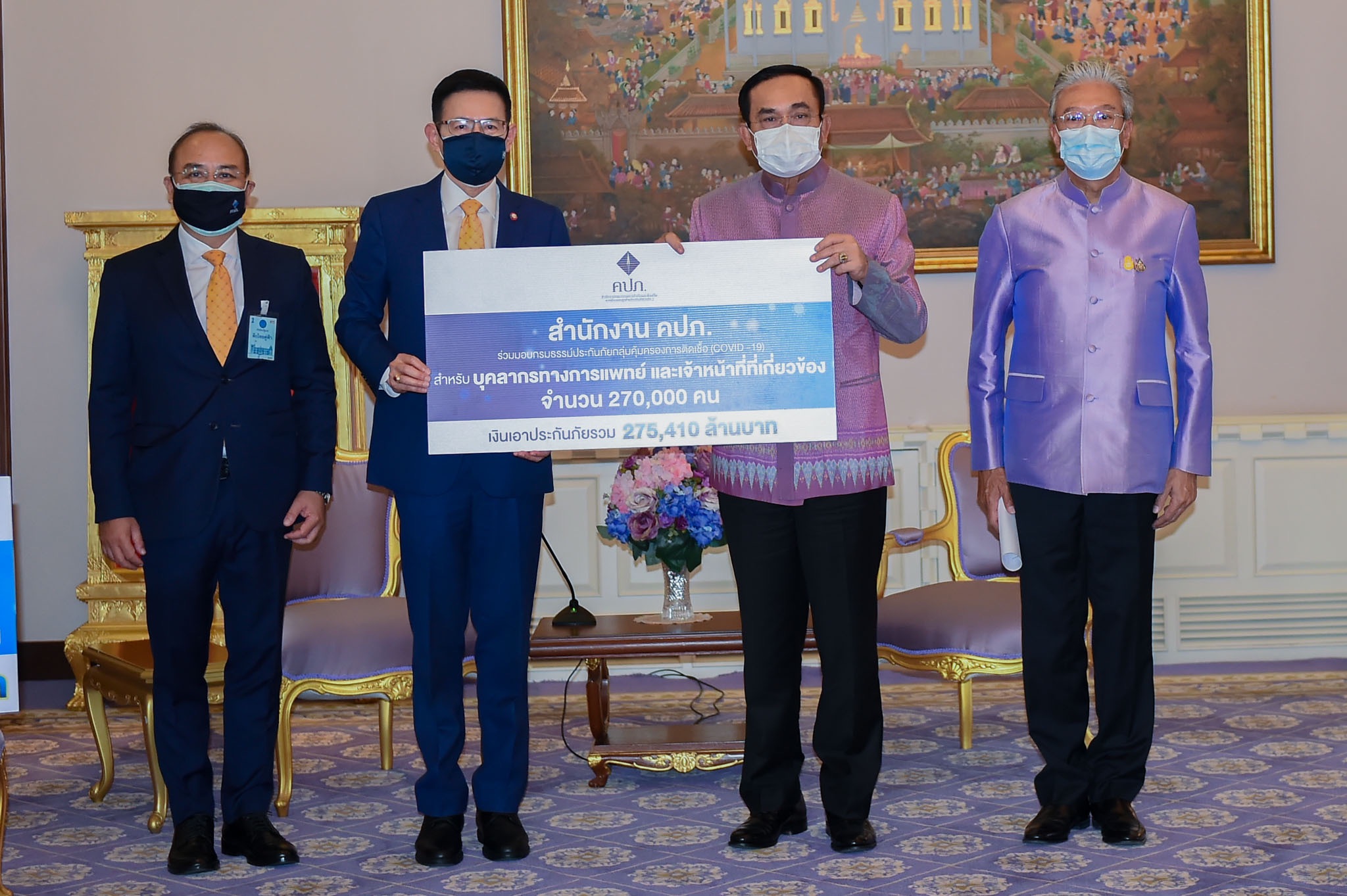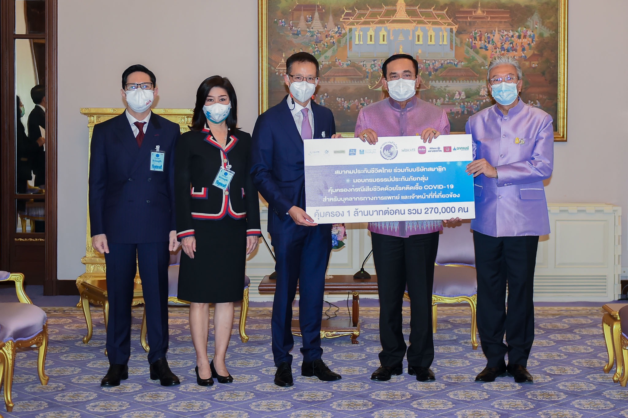 โดยพลเอกประยุทธ์ จันทร์โอชา นายกรัฐมนตรี ให้เกียรติรับมอบกรมธรรม์ประกันภัย เพื่อส่งมอบแก่บุคลากรทางการแพทย์และเจ้าหน้าที่ที่ปฏิบัติงานใกล้ชิดผู้ติดเชื้อ COVID-19 ในโอกาสนี้ นายกรัฐมนตรี ได้กล่าวขอบคุณทุกภาคส่วนที่ได้ช่วยเหลือกันอย่างเต็มที่ เหมือนกับที่เคยได้พูดไว้ว่าพวกเราต้องชนะไปด้วยกัน โดยเฉพาะการดูแลบุคลากร ทางการแพทย์และเจ้าหน้าที่ที่ปฏิบัติงานในส่วนหน้า