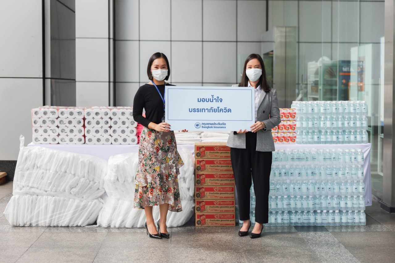 13 พฤษภาคม 2564 : บริษัท กรุงเทพประกันภัย จำกัด (มหาชน) หรือ BKI โดย ลสา โสภณพนิช (ซ้าย) ผู้อำนวยการธุรกิจนายหน้า เป็นผู้แทนบริษัทฯ มอบอุปกรณ์และสิ่งของจำเป็นต่างๆ ได้แก่ ชุด PPE จำนวน 800 ชุด น้ำดื่ม 300 แพ็ก นมไวตามิ้ลค์ 300 แพ็ก มุ้ง 100 หลัง ผ้าขนหนู 400 ผืน กระดาษทิชชู 417 แพ็ก ภาชนะใส่อาหารและแก้วน้ำ 400 ชุด ถุงขยะ 300 แพ็ก มูลค่ารวม 300,000 บาท ให้แก่ นางผลิพร ธัญญอนันต์ผล (ขวา) ผู้อำนวยการสำนักสื่อสารสาธารณะและระดมความร่วมมือ กองทุนเพื่อความเสมอภาคทางการศึกษา (กสศ.)
