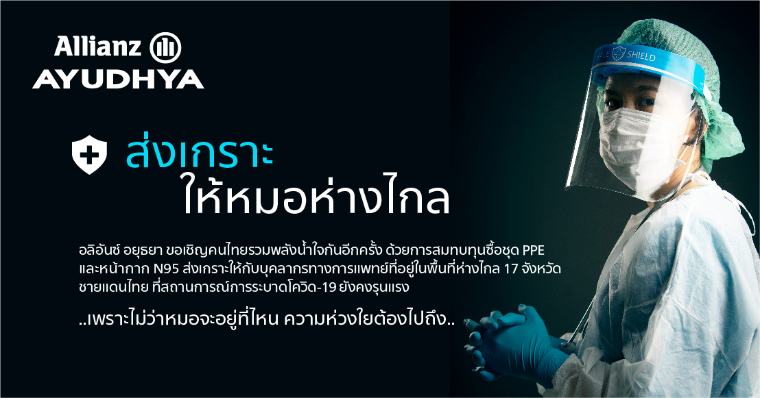 17 พฤษภาคม 2564 : บมจ. อลิอันซ์ อยุธยา ประกันชีวิต ขอเชิญร่วมส่งต่อความห่วงใยให้บุคลากรทางการแพทย์ ในสถานการณ์การแพร่ระบาดโควิด-19 ที่มีผู้ติดเชื้อเพิ่มขึ้นทุกวัน ภายใต้โครงการ “ส่งเกราะให้หมอห่างไกล” สานต่อจากโครงการ “ส่งเกราะให้หมอกัน” เพื่อระดมทุนจัดซื้อชุด PPE และหน้ากาก N95 ที่ได้มาตรฐานทางการแพทย์ มอบให้กับ 40 โรงพยาบาล ในพื้นที่ห่างไกล 17 จังหวัดติดชายแดนไทย ที่สถานการณ์การระบาดโควิด-19 ยังคงรุนแรง
