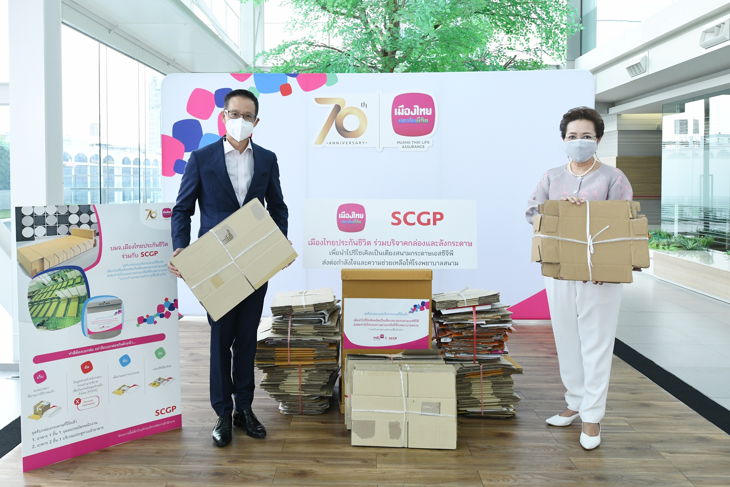 17 พฤษภาคม 2564 : นายสาระ ล่ำซำ กรรมการผู้จัดการและประธานเจ้าหน้าที่บริหาร นางพิตราภรณ์ บุณยรัตพันธุ์ รองกรรมการผู้จัดการอาวุโส บริษัท เมืองไทยประกันชีวิต จำกัด (มหาชน) มอบกล่องและลังกระดาษที่มีสภาพดีที่ไม่ได้ใช้งานแล้ว จากการรณรงค์ให้พนักงานของบริษัทฯ มีส่วนร่วมในการรช่วยเหลือสังคม ให้แก่บริษัท เอสซีจี แพคเกจจิ้ง จำกัด (มหาชน) (SCGP) เพื่อนำไปเข้ากระบวนการรีไซเคิลของ SCGP และแปรรูปให้เป็น เตียงกระดาษและมอบให้กับโรงพยาบาลสนามแห่งต่างๆ ต่อไป สำหรับใช้ในช่วงสถานการณ์การแพร่ระบาดของโรคติดเชื้อไวรัสโคโรนา 2019 (COVID-19) ณ เมืองไทยประกันชีวิต สำนักงานใหญ่ ![]()
