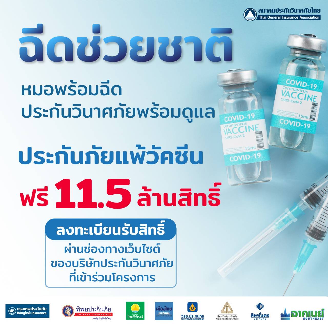 สมาคมประกันวินาศภัยไทย ในฐานะตัวแทนของภาคธุรกิจประกันวินาศภัยไทยที่ส่งเสริมการนำระบบประกันภัยเข้ามาช่วยในการบริหารความเสี่ยงให้กับประชาชนและประเทศชาติ มีความห่วงใยต่อวิกฤติการแพร่ระบาดของเชื้อไวรัส COVID-19 ที่ส่งผลกระทบต่อเศรษฐกิจและสังคม จึงได้ประชุมหารือร่วมกับบริษัทสมาชิกจัดโครงการ "ฉีดช่วยชาติ หมอพร้อมฉีด ประกันวินาศภัยพร้อมดูแล" ขึ้น เพื่อมอบกรมธรรม์ประกันภัยคุ้มครองการแพ้วัคซีนให้กับประชาชนทั่วไปฟรี จำนวน 11.5 ล้านสิทธิ์ เพื่อเป็นการสร้างความมั่นใจและกระตุ้นให้ประชาชนเข้ารับการฉีดวัคซีนป้องกัน COVID-19 กันมากขึ้น