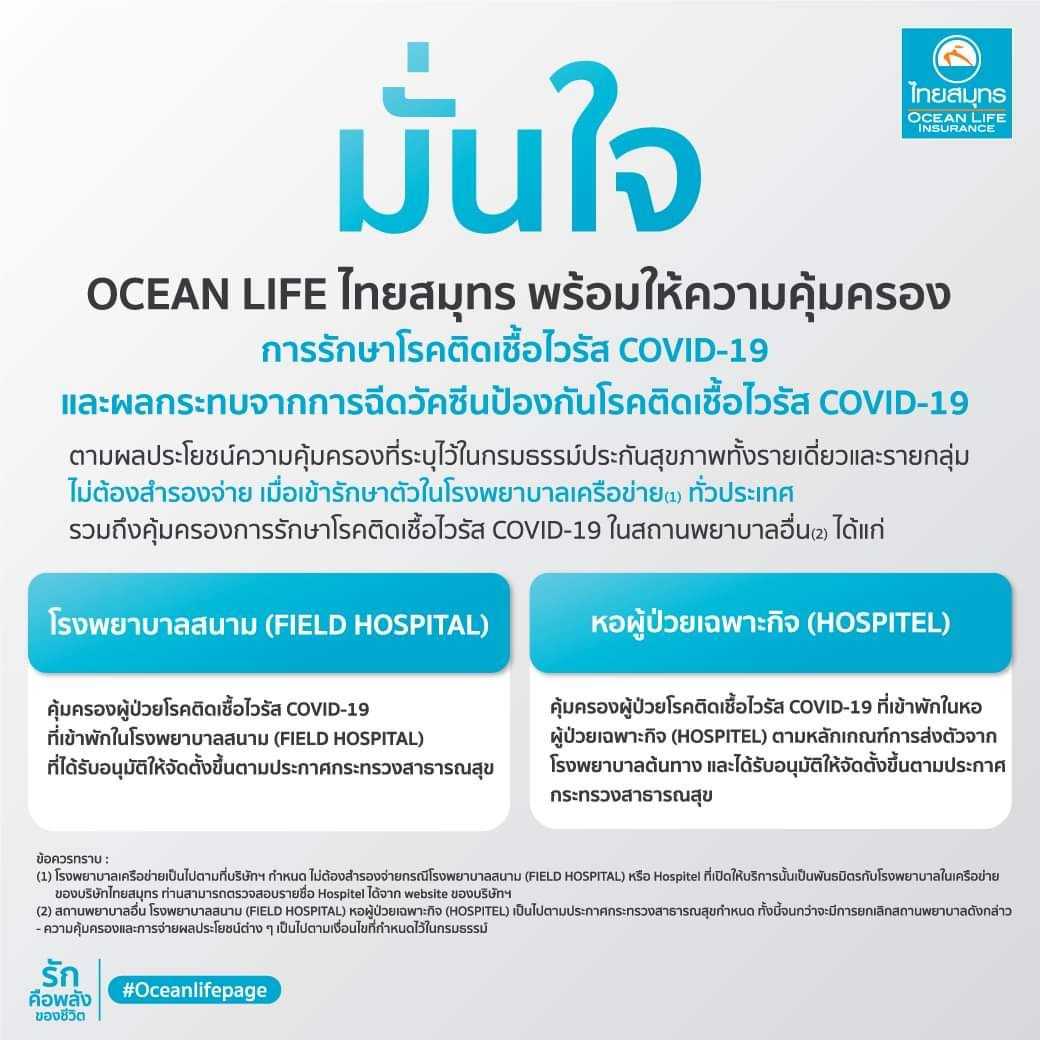OCEAN LIFE ไทยสมุทร พร้อมดูแลและให้ความคุ้มครอง COVID-19 ประกอบด้วย ความคุ้มครองการรักษาโรคติดเชื้อไวรัส COVID-19 และความคุ้มครองผลกระทบจากการฉีดวัคซีนป้องกันโรคติดเชื้อไวรัส COVID-19 ตามผลประโยชน์ความคุ้มครองที่ระบุไว้ในกรมธรรม์ ทั้งประกันสุขภาพรายเดี่ยวและรายกลุ่ม โดยไม่ต้องสำรองจ่าย เมื่อเข้ารักษาตัวในโรงพยาบาลเครือข่ายของบริษัทไทยสมุทรทั่วประเทศ รวมถึงคุ้มครองการรักษาโรคติดเชื้อไวรัส COVID-19 ในสถานพยาบาลอื่น* ได้แก่ โรงพยาบาลสนาม (FIELD HOSPITAL) และหอผู้ป่วยเฉพาะกิจ (HOSPITEL)