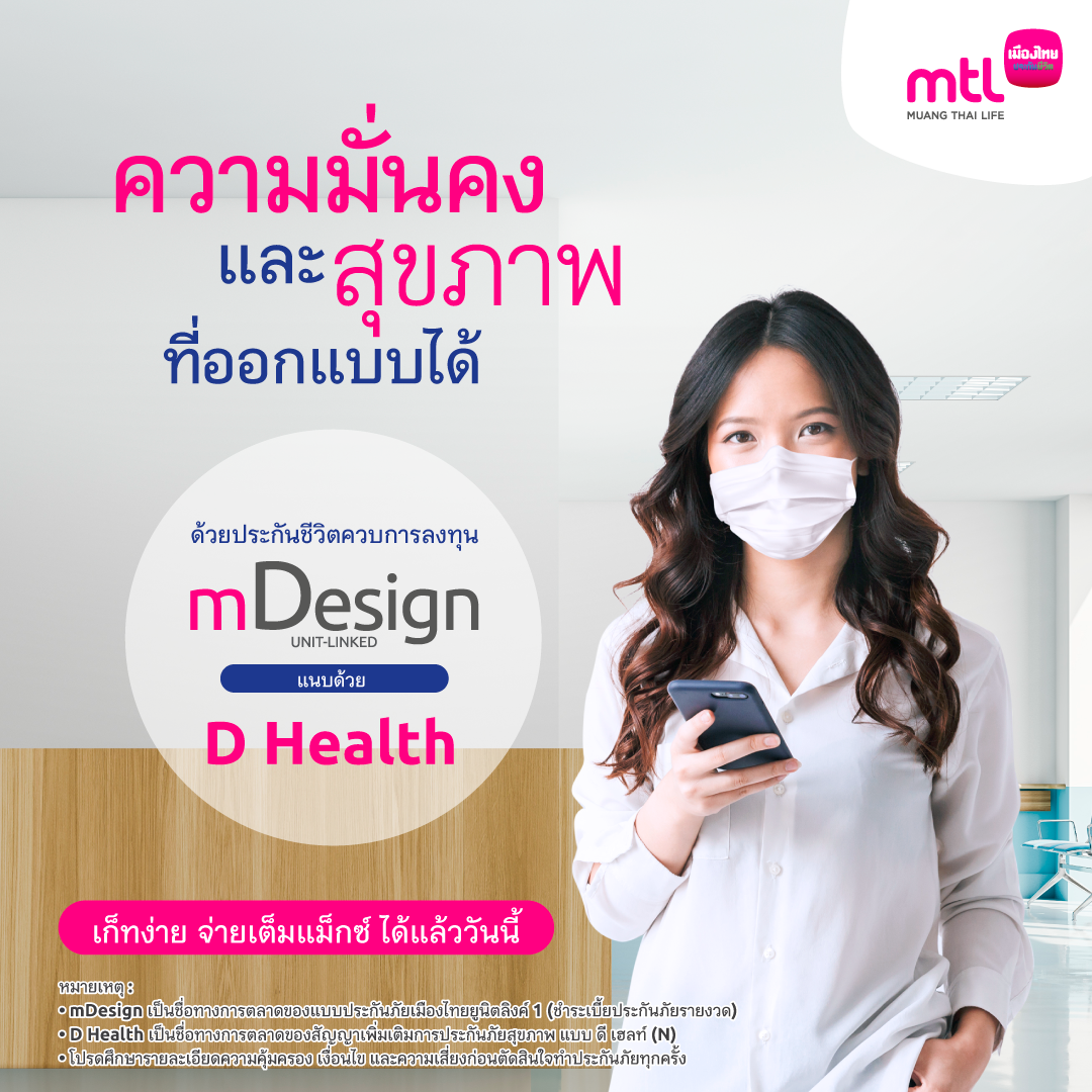 ทั้งนี้ ความคุ้มครองสุขภาพ D Health เป็นสัญญาเพิ่มเติมแบบชำระค่าการประกันภัยโดยการหักจากมูลค่าการลงทุน ใช้แนบกับแบบประกันชีวิตควบการลงทุน mDesign ที่ตอบโจทย์การวางแผนทางการเงินของลูกค้าได้อย่างยืดหยุ่น โดยสามารถกำหนดความคุ้มครองชีวิต ระยะเวลาชำระเบี้ยประกันภัย และการลงทุนได้ด้วยตนเอง ในขณะที่สามารถเพิ่มเงินออมเพื่อการลงทุน ถอนเงินลงทุนออกบางส่วน หรือหยุดพักชำระเบี้ยก็สามารถทำได้ ทั้งยังสามารถเพิ่มความอุ่นใจด้วยสัญญาเพิ่มเติมการประกันภัยสุขภาพและโรคร้ายแรง โดยเบี้ยประกันภัยคงที่ตลอดอายุสัญญา