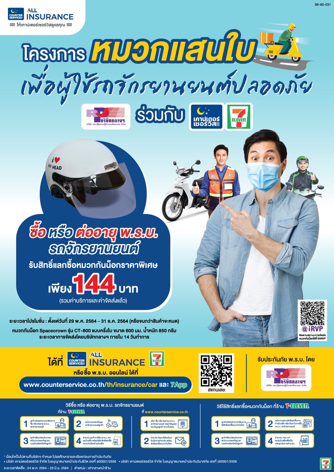โดยเงื่อนไขในการซื้อหมวกกันน็อก เมื่อประชาชน ซื้อ/ต่อ ประกันภัย พ.ร.บ.รถจักรยานยนต์ ที่หน้าร้านเซเว่นอีเลฟเว่น จะได้รับใบเสร็จและมีบาร์โค๊ดสิทธิแลกซื้อหมวกกันน็อกที่ท้ายใบเสร็จนั้น หรือประชาชนซื้อ/ต่อประกันภัย พ.ร.บ.รถจักรยานยนต์แบบออนไลน์ ผ่าน www.counterservice.co.th ก็จะได้รับอีเมล์ยืนยันและบาร์โค๊ดสิทธิแลกซื้อหมวกกันน็อกได้เช่นกัน