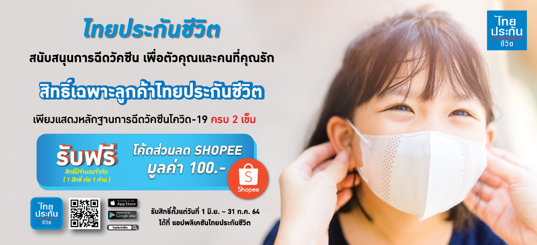 โดยมอบสิทธิพิเศษเฉพาะลูกค้าไทยประกันชีวิต เพียงแสดงหลักฐานการฉีดวัคซีนโควิด-19 ครบ 2 เข็ม ผ่านแอปพลิเคชัน ไทยประกันชีวิต จะได้รับโค้ดส่วนลด Shopee มูลค่า 100 บาท จำนวน 20,000 สิทธิ์ สำหรับขั้นตอนการรับสิทธิ์ผู้เอาประกันภัยที่ลงทะเบียนใช้งานแอปพลิเคชัน ไทยประกันชีวิตแล้ว คลิกที่แบนเนอร์กิจกรรมเพื่อกรอกเลขบัตรประชาชน พร้อมแนบเอกสารแสดงการฉีดวัคซีนโควิด-19 ครบ 2 เข็ม จะได้รับ SMS โค้ดส่วนลด Shopee มูลค่า 100 บาททันที สามารถรับสิทธิ์ได้ตั้งแต่วันที่1 มิถุนายน – 31 กรกฎาคม 2564 หรือจนกว่าสิทธิ์ครบตามจำนวนที่กำหนด จำกัด 1 ท่านต่อ 1 สิทธิ์