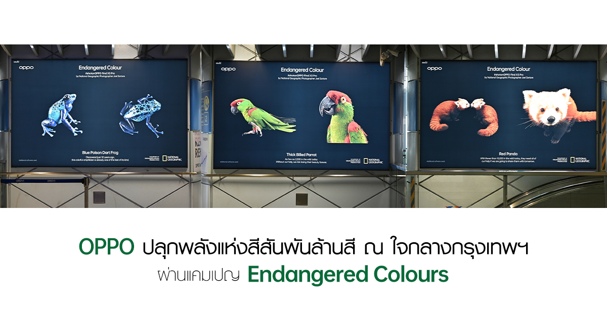 โดยล่าสุดภาพถ่ายสีสันพันล้านสีของสัตว์นานาชนิดได้ถูกจัดแสดงอย่างยิ่งใหญ่ ณ ใจกลางกรุงเทพฯ ซึ่งนอกจากจะเป็นการกระตุ้นให้คนไทยได้ตระหนักถึงความสำคัญของธรรมชาติแล้ว ยังเป็นการแสดงประสิทธิภาพกล้องของสมาร์ทโฟนแฟล็กชิพ OPPO Find X3 Pro 5G ที่มาพร้อมด้วยกล้องหลักคู่ 50MP เซ็นเซอร์ Sony IMX766 ถึงสองตัวครั้งแรกของโลก และเทคโนโลยี 10-bit Full-path Colour Engine ระบบการประมวลสีตั้งแต่การถ่ายภาพไปจนถึงการแสดงผลให้สามารถสัมผัสประสบการณ์สีที่นุ่มนวลและสมจริงได้มากถึงหนึ่งพันล้านสีอีกด้วย