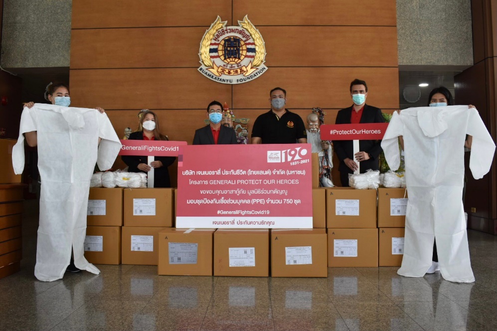 โดยมี ช่อฟ้า ยุกตะนันท์ ประธานเจ้าหน้าที่บริหารฝ่ายการตลาดและบริหารลูกค้า (ซ้ายสุด) พร้อมด้วย มาร์โค เอนนีโล ประธานเจ้าหน้าที่บริหารฝ่ายปฏิบัติการ (ขวาสุด) ร่วมมอบ ทั้งนี้ลูกค้าของเจนเนอราลี่ยังสามารถร่วมสมทบทุนเพื่อซื้อชุด PPE ด้วยการแลกคะแนนสะสมพิเศษ (Point) ผ่านแอปพลิเคชัน Generali365 โดยทุก 100 คะแนน แทนเป็นเงินบริจาคได้ 10 บาทได้จนถึงวันที่ 30 มิถุนายน 2564