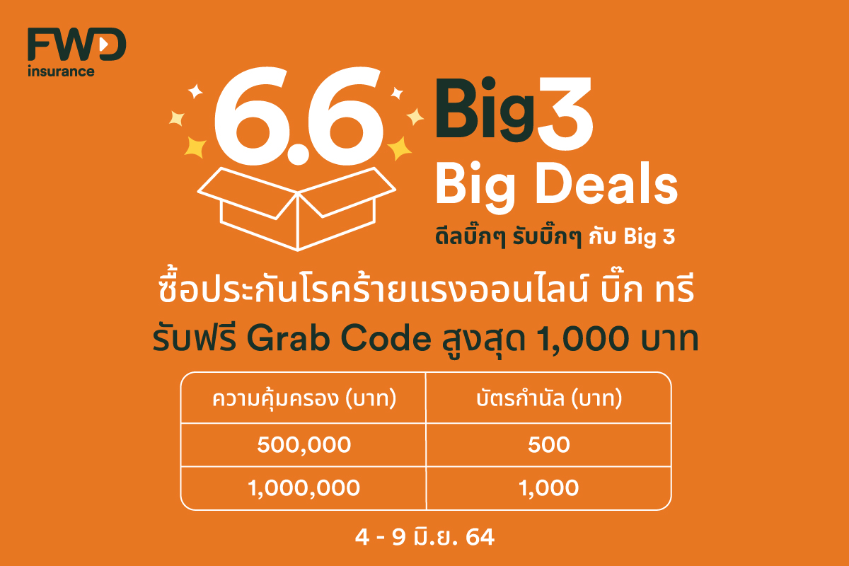 4 มิถุนายน 2564 : บริษัท เอฟดับบลิวดี จำกัด (มหาชน) (FWD ประกันชีวิต) สนับสนุนให้ทุกคน ‘Celebrate living’ ใช้ชีวิตเต็มที่ ตามรูปแบบที่ทุกคนต้องการ ด้วยผลิตภัณฑ์ความคุ้มครองที่สมัครได้ง่ายๆ พร้อมข้อเสนอ Flash Sale สุดพิเศษ ‘6.6 Big 3, Big Deals ดีลบิ๊กๆ รับบิ๊กๆ รับโค้ด Grab สูงสุด 1,000 บาท เมื่อซื้อผลิตภัณฑ์ FWD ประกันชีวิตที่ร่วมรายการ ผ่านช่องทางออนไลน์ ตั้งแต่วันที่ 4-9 มิ.ย.64 คลิก https://fwdth.co/Big366