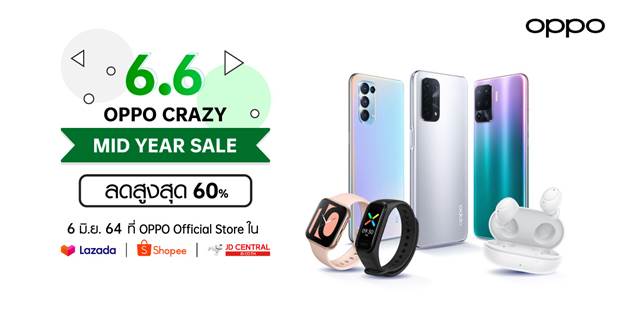 5 มิถุนายน 2564 : OPPO มอบโปรฯ แรงสุดคุ้มกลางปี ในแคมเปญ OPPO 6.6 Crazy Mid Year Sale ด้วยส่วนลดสมาร์ทโฟนและอุปกรณ์เสริมสูงสุดถึง 60% พร้อมคูปองส่วนลดสูงสุดถึง 1,100 บาท และของสมนาคุณอีกมากมายรวมมูลค่า 200,066 บาท ห้ามพลาด! เฉพาะ 6 มิถุนายนนี้ ที่ OPPO Official Store บน Shopee, Lazada และ JD Central โดยรายละเอียดโปรฯ สุดคุ้มมีดังนี้
