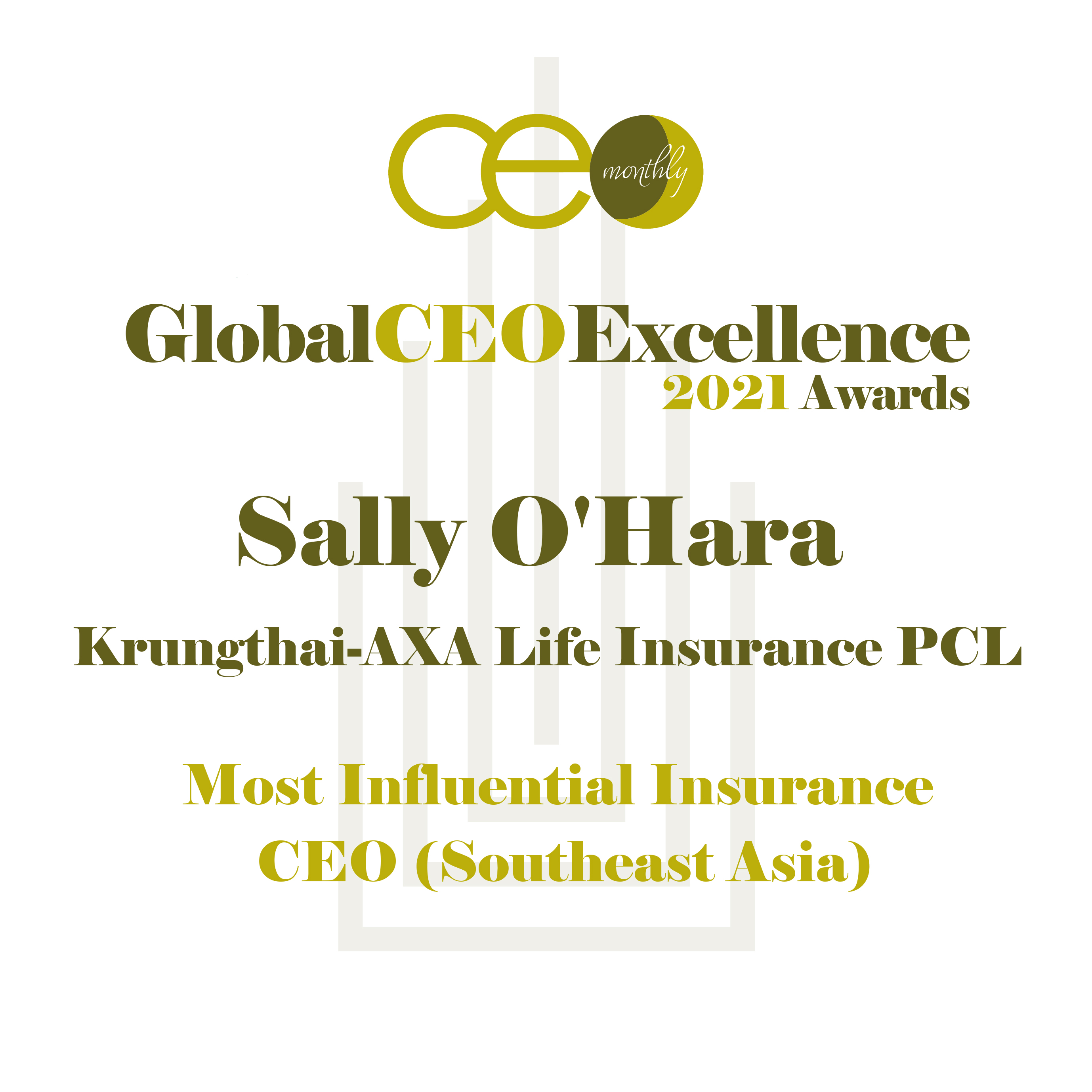 8 มิถุนายน 2564 : คุณแซลลี่ โอฮาร่า ประธานเจ้าหน้าที่บริหาร บมจ.กรุงไทย-แอกซ่า ประกันชีวิต คว้า รางวัล CEO ที่ทรงอิทธิพลที่สุดในแวดวงประกันภัย ในระดับเอเซียตะวันออกเฉียงใต้ หรือ ‘Most Influential Insurance CEO (Southeast Asia) จาก Global CEO Excellence Awards 2021