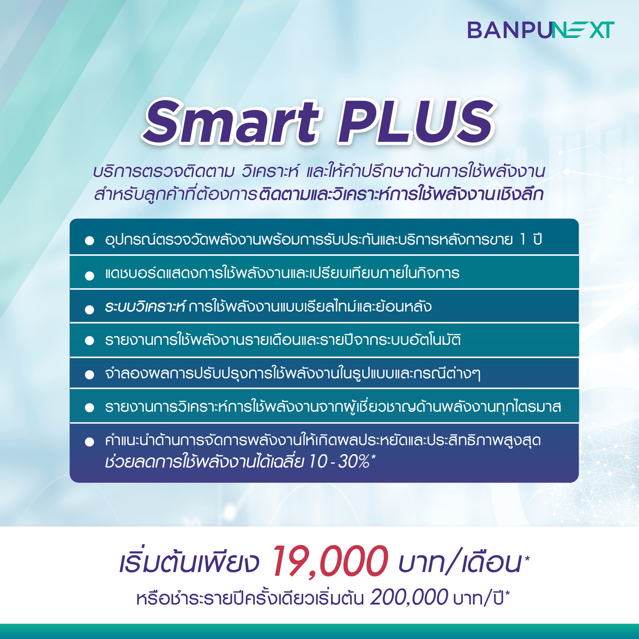 สมาร์ทพลัส (Smart PLUS) สำหรับผู้ประกอบการที่ต้องการติดตามและวิเคราะห์การใช้พลังงานเชิงลึก เหมาะกับกิจการประเภทโรงงานและอาคารควบคุมที่ต้องจัดทำรายงานการจัดการพลังงานเป็นประจำ มีค่าไฟฟ้าประมาณ 150,000 – 1,000,000 บาทต่อเดือน ค่าบริการรายปีเริ่มต้น 200,000 บาท หรือ 19,000 บาทต่อเดือน โดยผลลัพธ์เมื่อทำตามคำแนะนำ สามารถช่วยลดการใช้ไฟฟ้าได้เฉลี่ย 10 - 30%