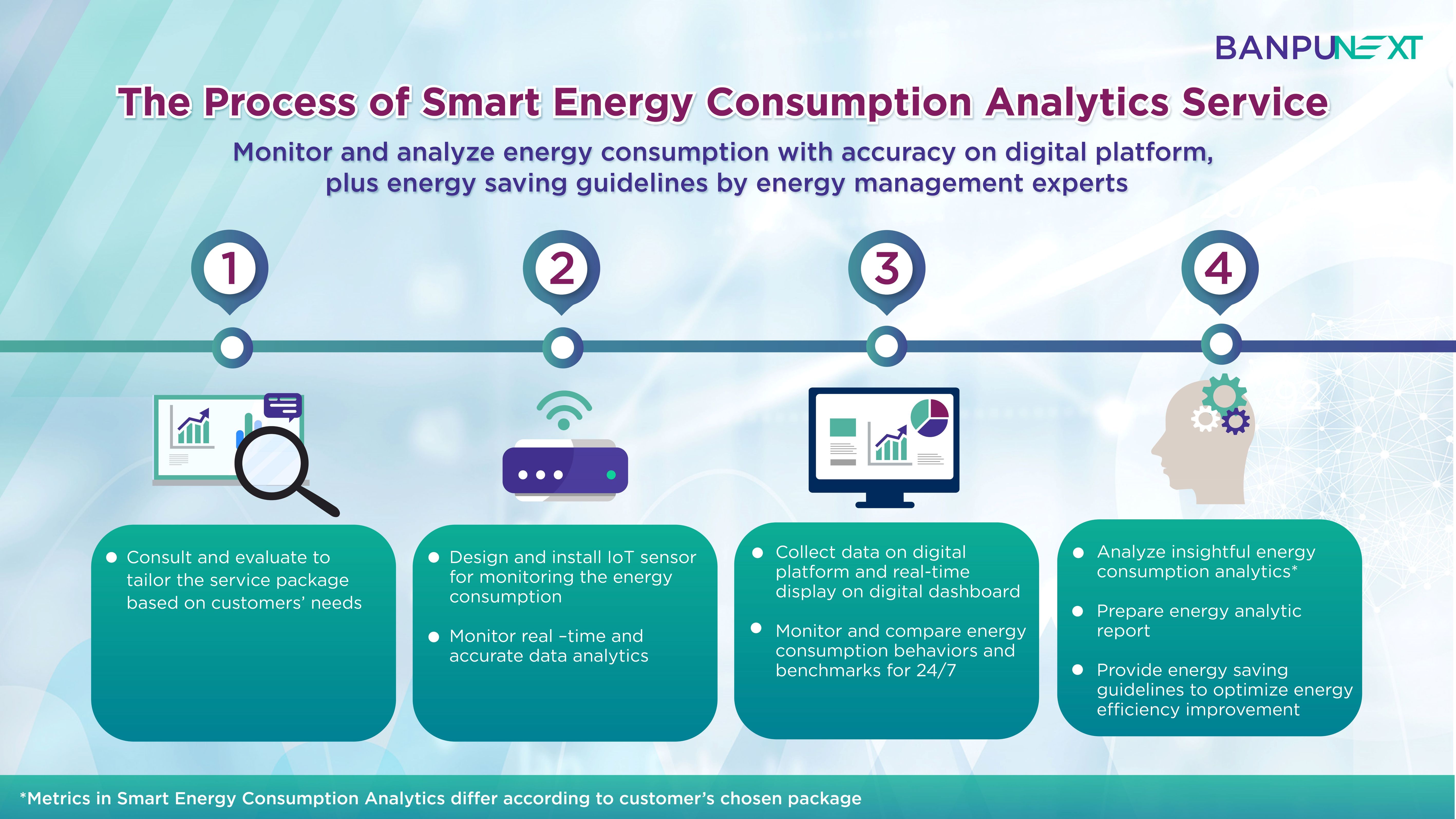 โดยเป็นบริการภายใต้โซลูชันฉลาดวิเคราะห์ (Smart Data Analytics) ซึ่งเป็นหนึ่งในโซลูชันพลังงานฉลาดของบ้านปู เน็กซ์ มอบบริการที่ครบวงจร พร้อมผู้เชี่ยวชาญดูแลทุกขั้นตอนตั้งแต่ 1. แนะนำ และประเมินรูปแบบการให้บริการที่เหมาะสมกับประเภทธุรกิจและความต้องการของลูกค้า 2. ออกแบบ และติดตั้งอุปกรณ์ IoT เซนเซอร์ สำหรับตรวจวัดการใช้พลังงาน เพื่อการตรวจวัดข้อมูลแบบเรียลไทม์ และแม่นยำ 3. เก็บข้อมูลบนดิจิทัลแพลตฟอร์ม และแสดงผลบนดิจิทัลแดชบอร์ดแบบเรียลไทม์