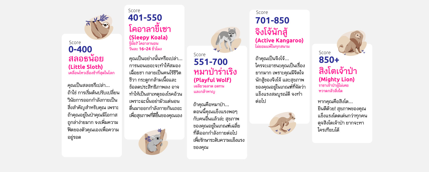 1. การคำนวนคะแนนสุขภาพ (Health Score) ตามข้อมูลสุขภาพของผู้ใช้งาน เนื่องจากสุขภาพเป็นเรื่องซับซ้อน ดังนั้นเราจึงทำให้ง่ายสำหรับการใช้งาน ซึ่งคะแนนสุขภาพจะอิงตามคำแนะนำด้านสุขภาพระดับสากล นอกจากนี้ ผู้ใช้งานยังสามารถปรับปรุงสุขภาพของตนเองให้ดีขึ้น เพื่อให้สอดคล้องกับตัวแทนบุคลิกของคาแรคเตอร์แต่ละชนิดตามที่กำหนดไว้ตามคะแนนสุขภาพ