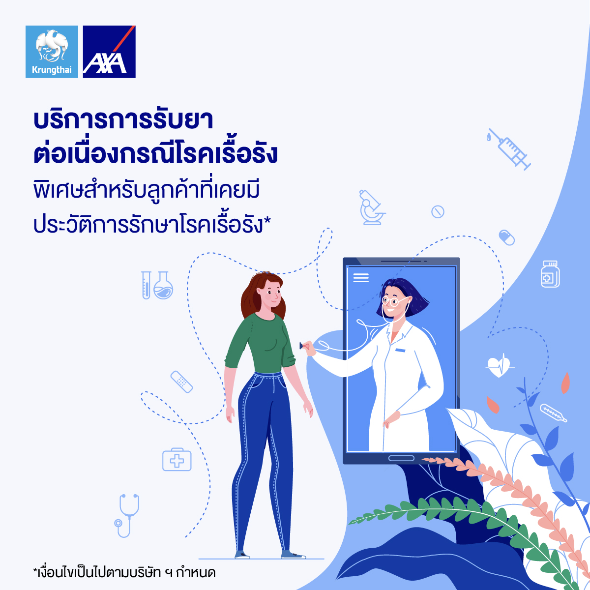 “บริการการรับยาต่อเนื่องกรณีโรคเรื้อรัง” เป็นบริการพิเศษสำหรับลูกค้าผู้ถือกรรมธรรม์ประกันสุขภาพของ บมจ.กรุงไทย-แอกซ่า ประกันชีวิต ที่เคยมีประวัติการรักษาโรคเรื้อรัง สำหรับลูกค้าที่สนใจใช้ “บริการการรับยาต่อเนื่องกรณีโรคเรื้อรัง” สามารถสอบถามข้อมูลเพิ่มเติมได้ที่ โทร 1159 ทุกวัน ตลอด 24 ชั่วโมง