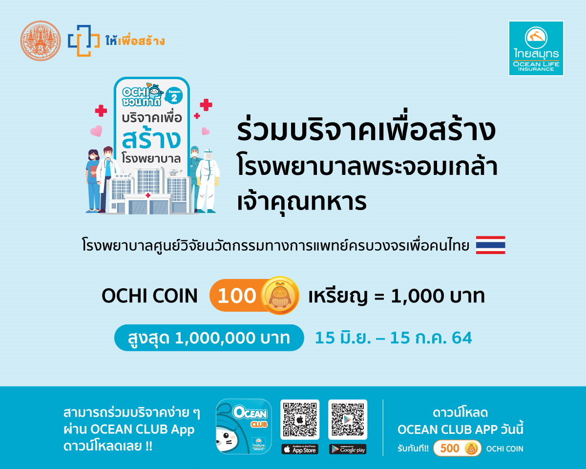 โดยสามารถร่วมบริจาคผ่าน OCEAN CLUB APP เพียงใช้ OCHI COIN 100 เหรียญ OCEAN LIFE ไทยสมุทรจะร่วมสมทบทุน 1,000 บาท สูงสุด 1,000,000 บาท ร่วมบริจาคได้ตั้งแต่วันนี้ - 15 กรกฎาคม 2564 OCEAN LIFE ไทยสมุทร เชื่อว่าพลังความรัก พลังของการให้ จะเป็นพลังที่ยิ่งใหญ่ในการสร้างอนาคตที่ดียิ่งกว่าให้กับคนไทยทุกคน
