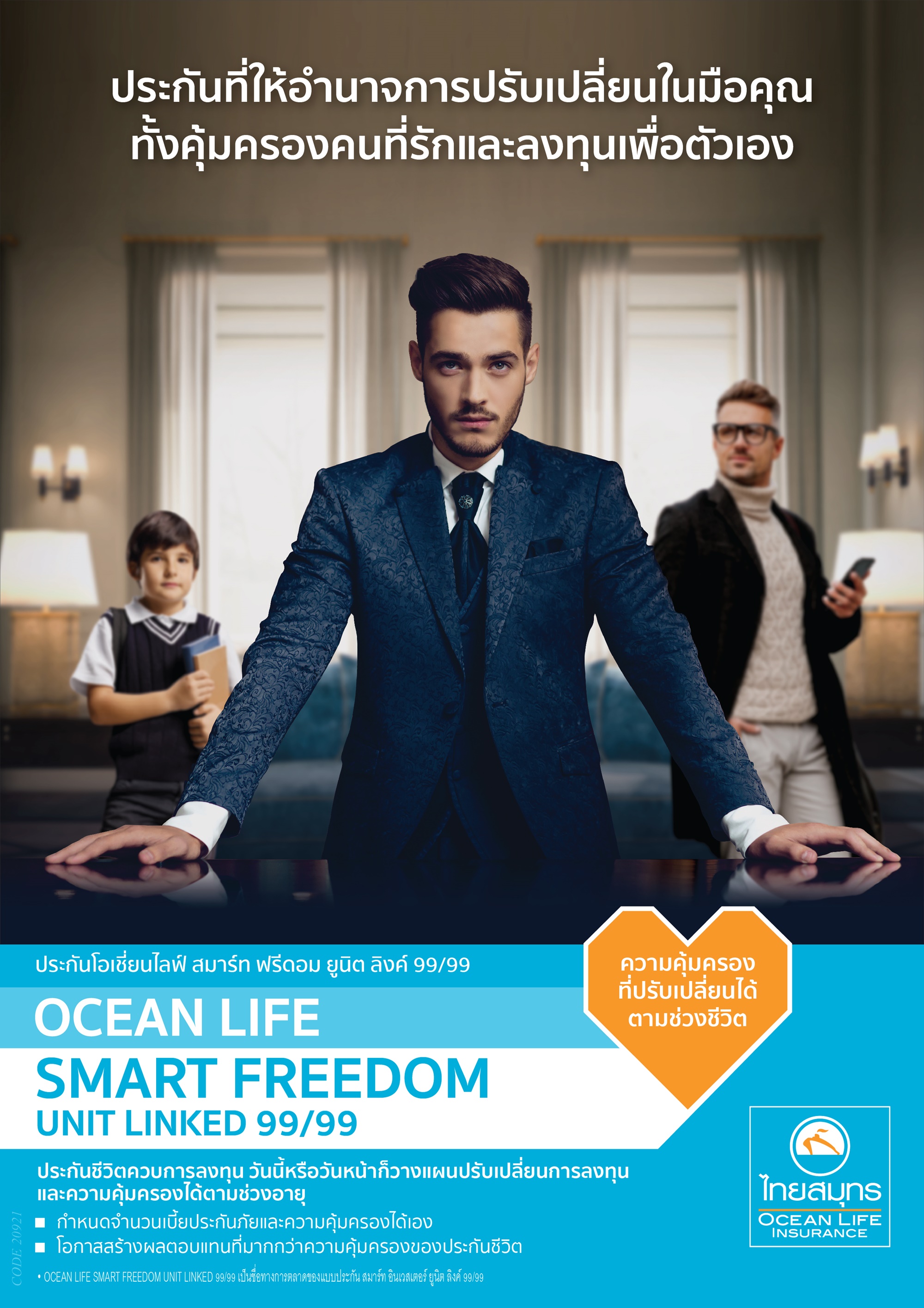 นอกจากนี้ OCEAN LIFE ไทยสมุทร ยังได้จัดเตรียมผู้เชี่ยวชาญทางด้านการลงทุน และแอปพลิเคชันช่วยวางแผนการลงทุนที่ทันสมัยไว้บริการ “โอเชี่ยนไลฟ์ สมาร์ท ฟรีดอม ยูนิต ลิงค์ 99/99” รับประกันภัยบุคคลอายุตั้งแต่ 30 วัน – 70 ปี คุ้มครองชีวิตจนถึงอายุครบ 99 ปี ชำระเบี้ยประกันภัยจนถึงอายุครบ 99 ปี โดยเบี้ยประกันภัยส่วนที่เป็นค่าใช้จ่ายของกรมธรรม์สามารถนำไปอ้างอิงลดหย่อนภาษีเงินได้บุคคลธรรมดาได้ตามหลักเกณฑ์ที่กรมสรรพากรกำหนด พร้อมรับโบนัสพิเศษ (Loyalty Bonus) หากผู้เอาประกันภัยปฏิบัติตามเงื่อนไขที่บริษัทฯ กำหนด