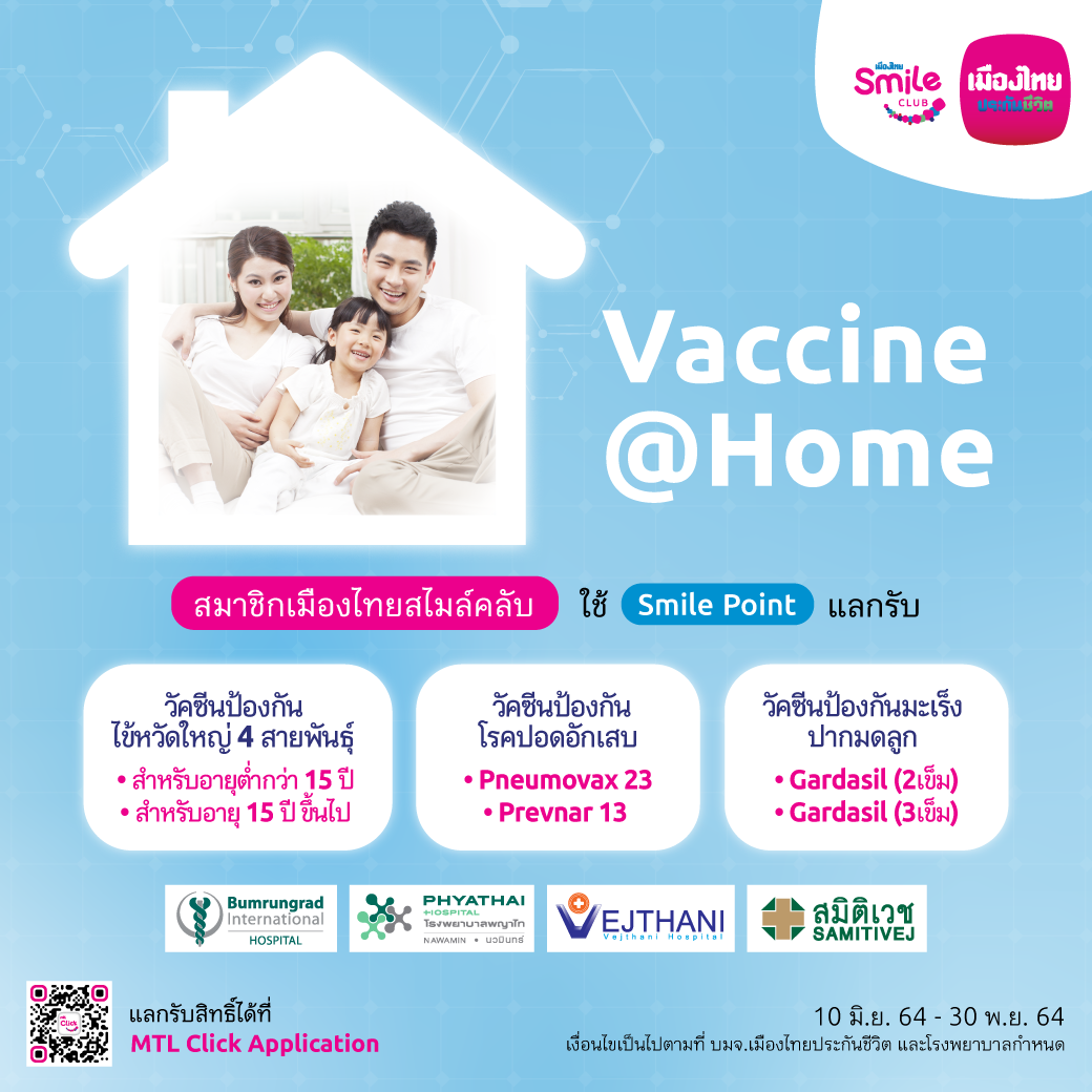 ล่าสุด บริษัทฯ จึงได้จัดกิจกรรมสุดพิเศษผ่านโครงการ “Vaccine@Home” ซึ่งเป็นบริการฉีดวัคซีนที่บ้านให้กับสมาชิกเมืองไทยสไมล์คลับเพื่อเสริมภูมิคุ้มกัน โดยที่สมาชิกฯ ที่มีความประสงค์ ไม่ต้องเดินทางไปยังโรงพยาบาลเพื่อรับการฉีดวัคซีนดังนี้ วัคซีนป้องกันไข้หวัดใหญ่ 4 สายพันธุ์, วัคซีนป้องกันคอตีบ บาดทะยัก ไอกรน, วัคซีนป้องกันปอดอักเสบ,วัคซีนป้องกันอีสุกอีใส, วัคซีนป้องกันงูสวัด และวัคซีนป้องกันมะเร็งปากมดลูก ซึ่งสิทธิพิเศษนี้สำหรับสมาชิกเมืองไทยสไมล์คลับเท่านั้น เพียงใช้คะแนนสะสม Smile Point ก็สามารถแลกรับบริการฉีดวัคซีน ที่บ้านได้ ภายใต้การให้บริการที่มีมาตรฐานของโรงพยาบาล รวมถึงเงื่อนไขที่กำหนดของโรงพยาบาลที่ร่วมโครงการ รายละเอียด ดังนี้