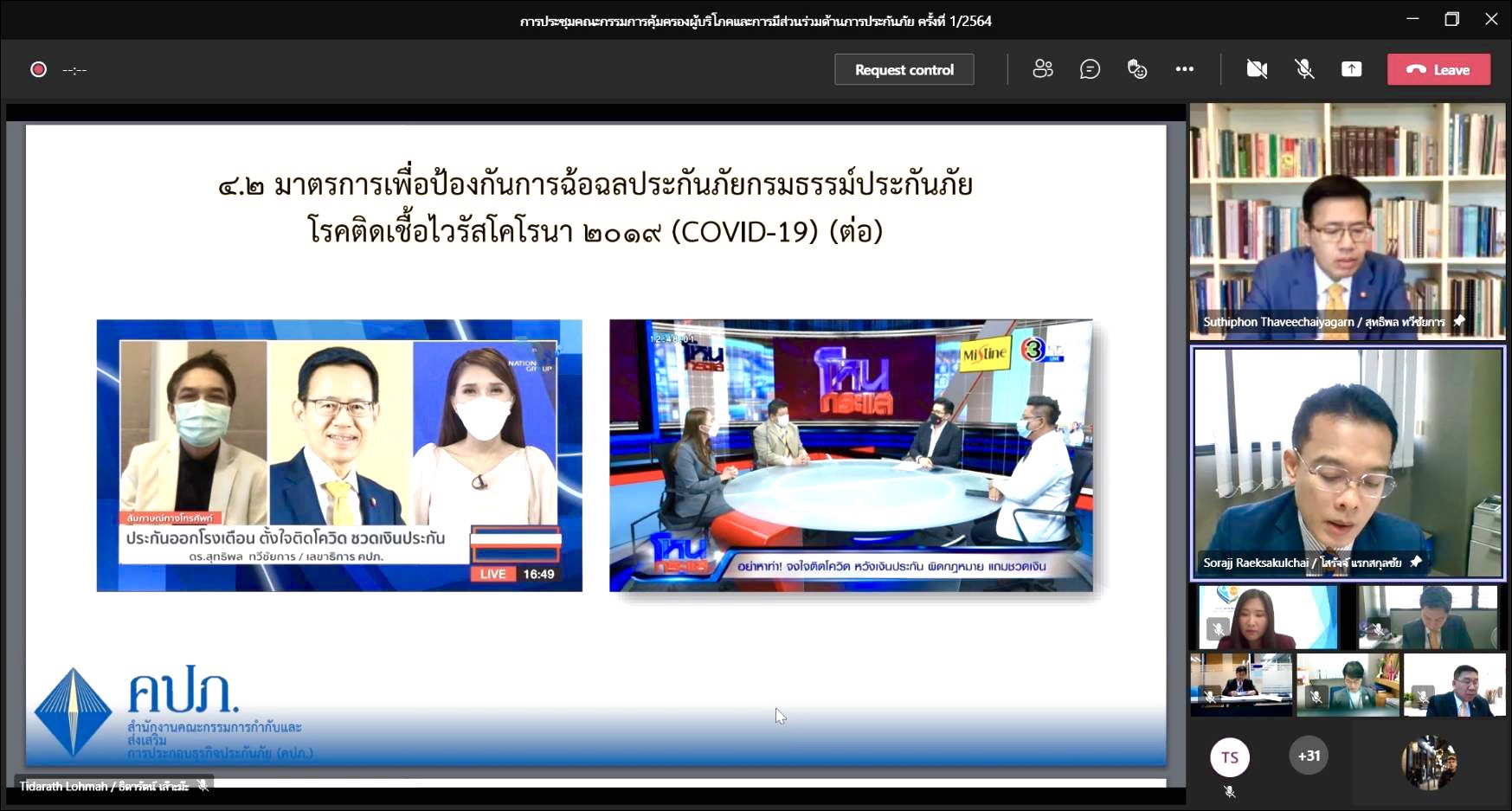 4 กรกฎาคม 2564 : ดร. สุทธิพล ทวีชัยการ เลขาธิการคณะกรรมการกำกับและส่งเสริมการประกอบธุรกิจประกันภัย (เลขาธิการ คปภ.) เปิดเผยว่า เมื่อวันที่ 1 กรกฎาคม 2564 ตนได้เป็นประธานการประชุมคณะกรรมการคุ้มครองผู้บริโภคและการมีส่วนร่วมด้านการประกันภัย ผ่านระบบออนไลน์ เพื่อรับฟังรายงานความคืบหน้าเกี่ยวกับมาตรการการเพิ่มประสิทธิภาพการคุ้มครองสิทธิประโยชน์ด้านการประกันภัย ตลอดจนพิจารณาและให้ข้อเสนอแนะเกี่ยวกับการเพิ่มประสิทธิภาพในการคุ้มครองผู้บริโภคด้านประกันภัย และพิจารณาประเด็นที่อยู่ในความสนใจของสังคม