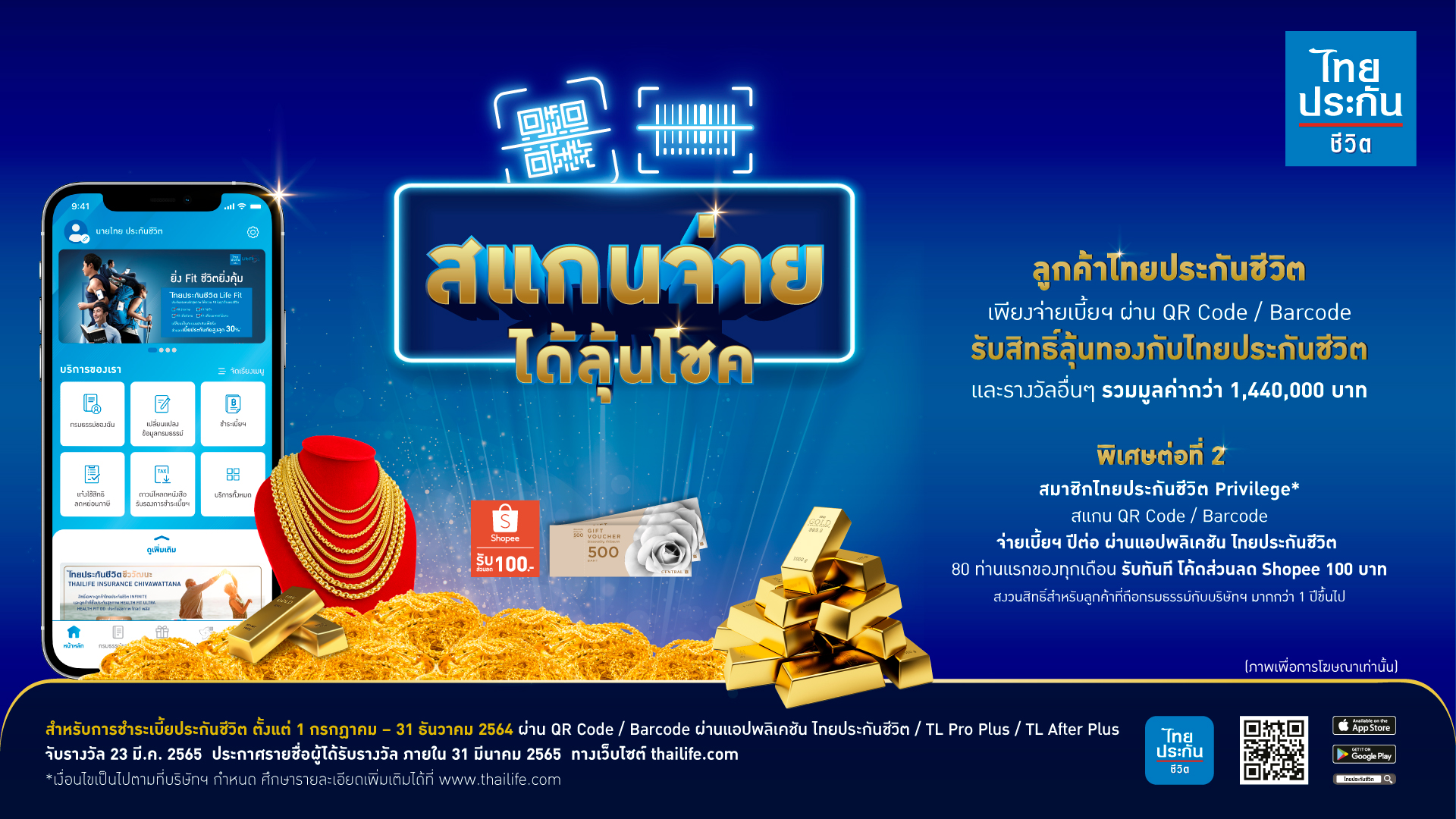 บริษัทฯ จึงจัดแคมเปญ “สแกนจ่ายได้ลุ้นโชค” สำหรับลูกค้าไทยประกันชีวิตที่ชำระเบี้ยประกันภัย ทั้งเบี้ยประกันภัยปีแรกและเบี้ยประกันภัยปีต่อ ผ่านการสแกน QR Code หรือ Barcode บนแอปพลิเคชัน ไทยประกันชีวิต ตั้งแต่วันนี้ – 31 ธันวาคม 2564 รับสิทธิ์ลุ้นรับรางวัลต่างๆ มากมาย อาทิ ทองคำแท่ง, ทองคำรูปพรรณ และบัตร Gift Voucher Central 500 บาท รวมมูลค่ากว่า 1,440,000 บาท ซึ่งผู้เอาประกันภัยจะได้รับ 1 สิทธิ์ต่อ 1 กรมธรรม์