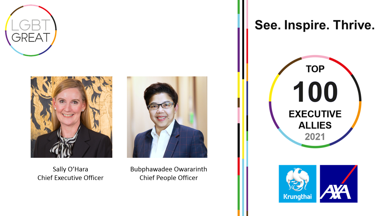 8 กรกฎาคม 2564 : นางแซลลี่ โอฮาร่า ประธานเจ้าหน้าที่บริหาร และนางสาวบุปผาวดี โอวรารินท์ ประธานเจ้าหน้าที่บริหารฝ่ายทรัพยากรบุคคล บมจ.กรุงไทย-แอกซ่า ประกันชีวิต ได้รับคัดเลือกให้เป็น Top 100 Executive Allies 2021 โดย LGBT Great รางวัลดังกล่าวจัดขึ้นเพื่อยกย่องผู้นำที่สร้างแรงบันดาลใจ กล้าที่จะก้าวขึ้นมาแสดงจุดยืน และแสดงให้เห็นถึงการเป็นพันธมิตรที่สนับสนุนกลุ่ม LGBT+ ถือเป็นอีกหนึ่งความภาคภูมิใจ และตอกย้ำจุดยืนของบริษัทฯ ในการมุ่งมั่นส่งเสริมความเท่าเทียมกัน พร้อมทั้งเคียงข้างทุกความเชื่อมั่น ดูแลกันตลอดไป