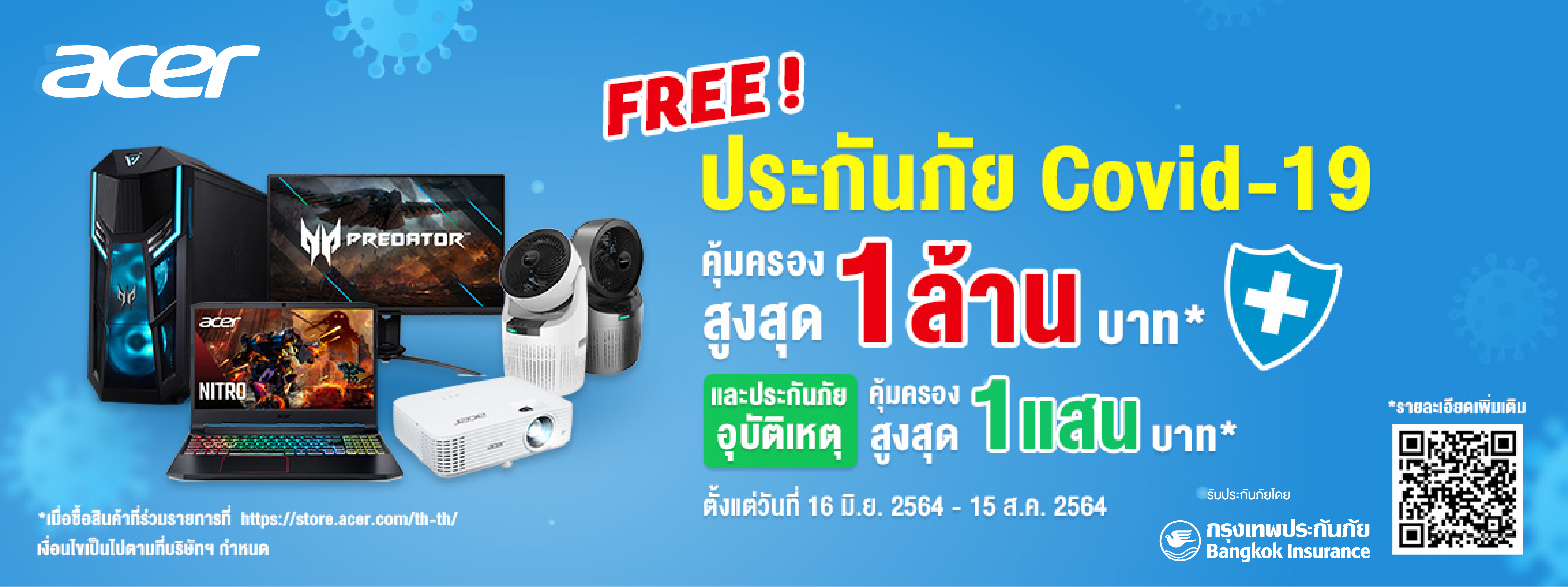 บริษัท เอเซอร์คอมพิวเตอร์ จำกัด ได้มอบความไว้วางใจ บริษัท กรุงเทพประกันภัย จำกัด (มหาชน) ในการทำประกันภัยโควิด คัฟเวอร์ เพื่อมอบเป็นสิทธิพิเศษฟรีให้แก่ลูกค้าที่ซื้อผลิตภัณฑ์ของเอเซอร์ผ่าน Acer Store เพื่อสร้างความอุ่นใจในช่วงที่สถานการณ์ในปัจจุบันยังพบการแพร่ระบาดของโรคติดเชื้อไวรัสโคโรนา 2019 (COVID-19) อย่างต่อเนื่อง โดยมีรายละเอียดความคุ้มครอง ดังนี้