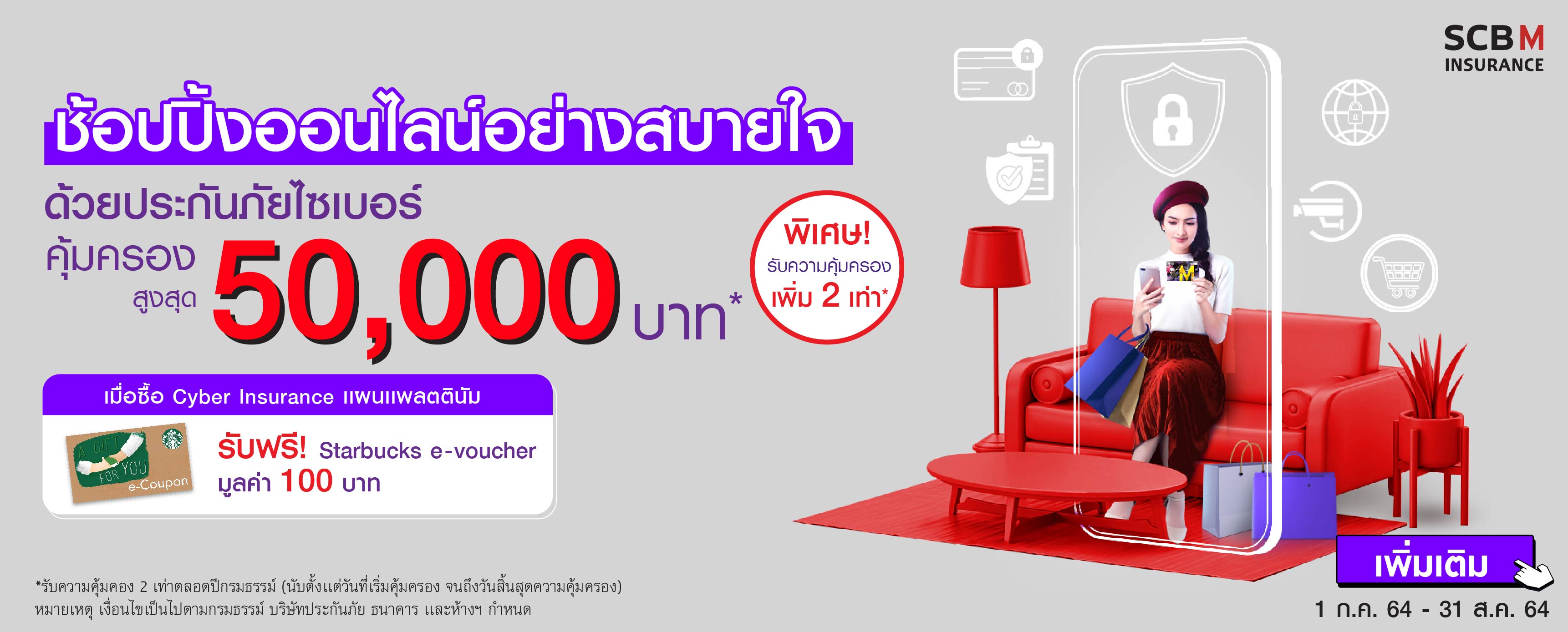 พิเศษ! สำหรับลูกค้าที่ซื้อผลิตภัณฑ์ประกันภัยไซเบอร์ (Cyber Insurance) ผ่าน MONLINE.COM จะได้รับความคุ้มครองเพิ่ม 2 เท่าตลอดปีกรมธรรม์ และรับฟรี! Starbucks e-voucher มูลค่า 100 บาท เมื่อซื้อประกันภัยไซเบอร์แผนแพลตตินัม และชำระค่าเบี้ยประกันผ่านบัตรเครดิต SCB M VISA ระหว่างวันที่ 1 กรกฎาคม 2564 – 31 สิงหาคม 2564