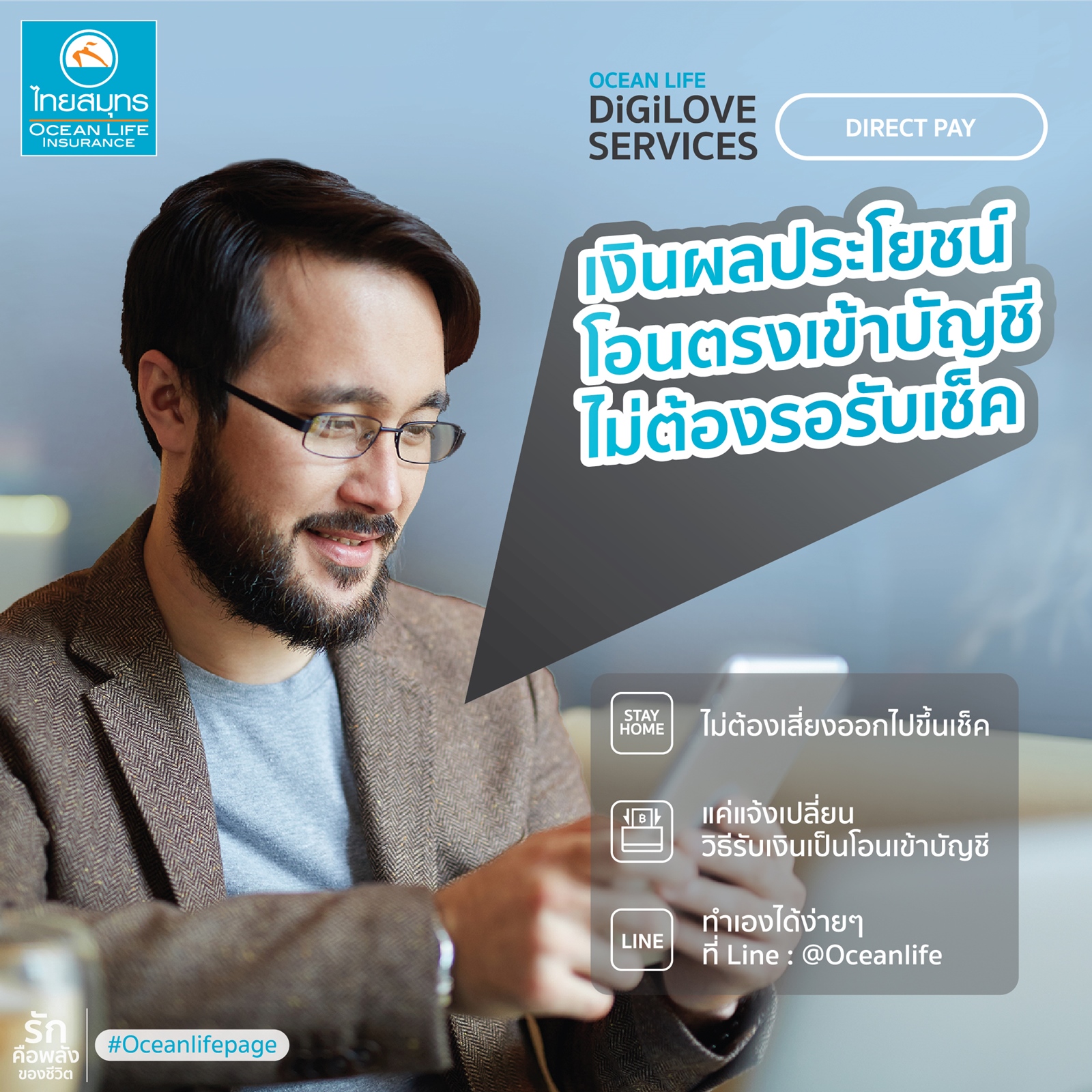 โดยได้ส่งบริการใหม่! OCEAN LIFE Direct Pay บริการรับเงินผลประโยชน์โอนเข้าบัญชีโดยตรง ลดความเสี่ยงจากการเดินทางไปขึ้นเช็ค ปลอดภัยกว่าด้วยระบบยืนยันตัวตนผ่าน LINE @Oceanlife ไม่ต้องส่งสำเนาเอกสารให้วุ่นวาย สามารถแจ้งเปลี่ยนวิธีรับเงินเป็นโอนเข้าบัญชีโดยตรงได้แล้ววันนี้ เพียงเข้าใช้งาน OCEAN CONNECT โดยกดเพิ่มเพื่อน Add LINE @Oceanlife และเลือกบริการลูกค้า จากนั้นเลือกเปลี่ยนแปลงวิธีรับผลประโยชน์ เพียงเท่านี้ก็รอรับเงินผลประโยชน์ผ่านบัญชีที่ลงทะเบียนได้เลย โดยไม่ต้องเดินทาง สะดวก ปลอดภัย และลดความเสี่ยงจากการติดเชื้อ COVID-19