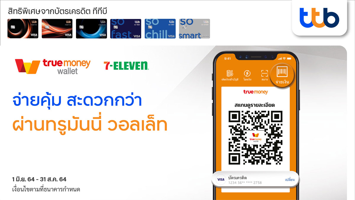12 กรกฎาคม 2564 : บัตรเครดิตทีทีบี มอบสิทธิพิเศษให้ลูกค้าจ่ายคุ้ม สะดวกกว่า พร้อมรับเครดิตเงินคืนสูงสุด 15% เมื่อใช้จ่ายที่ร้านเซเว่นอีเลฟเว่น ร้านค้าชั้นนำ เติมน้ำมัน หรือรถไฟฟ้าใต้ดิน MRT โดยชำระเงินด้วยบัตรเครดิตผ่านแอปพลิเคชัน ทรูมันนี่ วอลเล็ท ตั้งแต่วันนี้ ถึง 31 สิงหาคม 2564