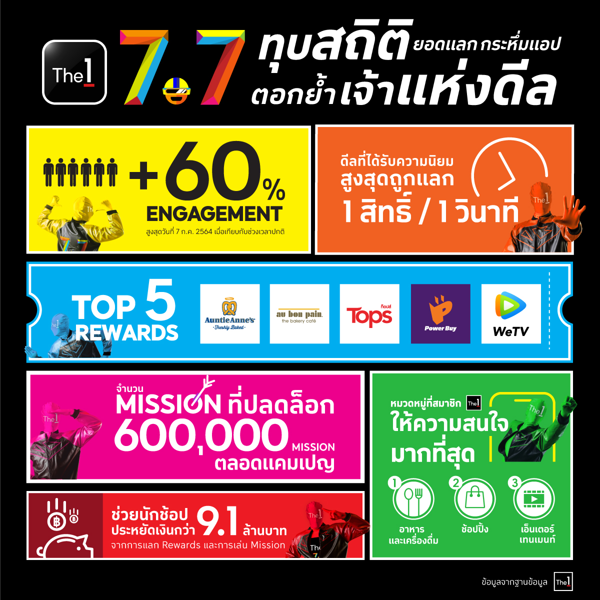 นอกจากให้สมาชิกแลกดีลสุดคุ้มด้วยคะแนน The 1 แล้ว ยังมีกิจกรรมพิชิตมิชชั่น 7 Days และ 7 Days Splash ที่ให้ลูกค้าสามารถสะสมคะแนน The 1 สูงถึง 6,332 คะแนน เมื่อทำภารกิจช้อปครบตามเงื่อนไขที่กำหนด โดยมียอดมิชชั่นที่ได้รับการปลดล็อคทั้งหมด 600,000 มิชชั่น โดยตลอดทั้งแคมเปญ 7.7 ช่วยให้นักช้อปประหยัดเงินจากการแลกรีวอร์ดและการเล่นมิชชั่นได้ถึง 9.1 ล้านบาท และมียอดผู้ใช้แอปทั้งหมดมากกว่า 4 ล้านคน![]()