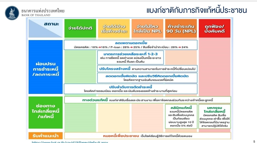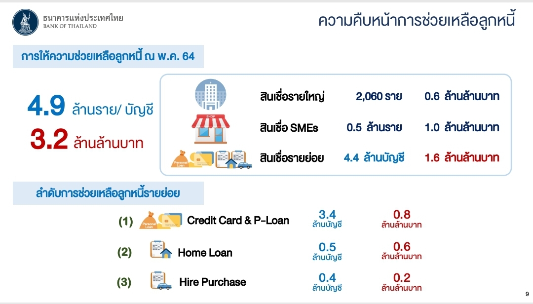 21 กรกฎาคม 2564 : นางสาวธัญญนิตย์ นิยมการ ผู้ช่วยผู้ว่าการ สายกำกับสถาบันการเงิน 2 ธนาคารแห่งประเทศไทย หรือ ธปท. เปิดเผยใน Media Briefing เรื่อง แบงก์ชาติกับภารกิจแก้หนี้ประชาชน ว่า ความคืบหน้าการช่วยเหลือลูกหนี้ ณ เดือนพ.ค.2564 รวมทั้งสิ้น 4.9 ล้านรายต่อบัญชี คิดเป็นเงิน 3.2 ล้านล้านบาท แบ่งเป็นสินเชื่อรายใหญ่จำนวน 2,060 ราย คิดเป็นเงิน 0.6 ล้านล้านบาท สินเชื่อ SMEs จำนวน 0.5 ล้านราย คิดเป็นเงิน 1.6 ล้านล้านบาท สินเชื่อรายย่อยจำนวน 4.4 ล้านบัญชี คิดเป็นเงิน 1.6 ล้านล้านบาท
