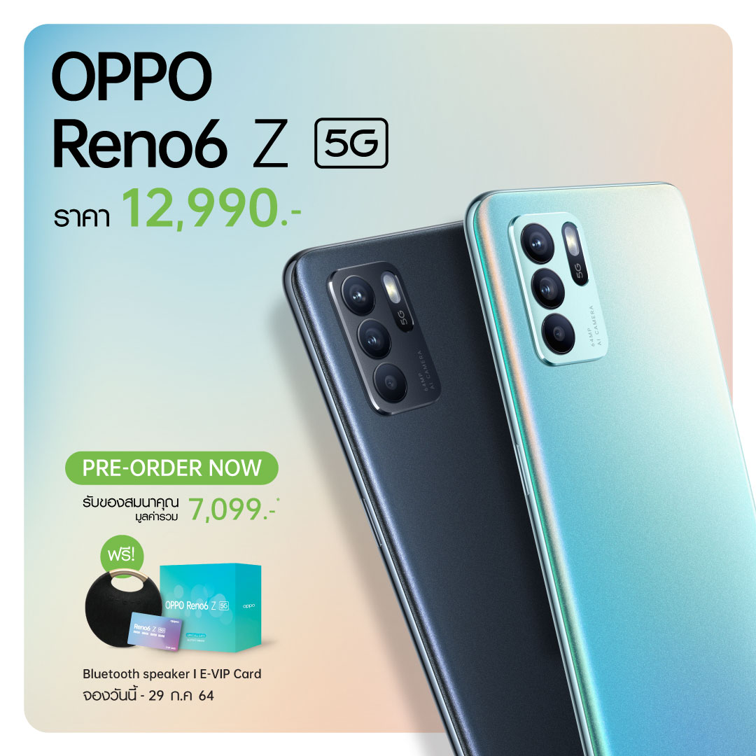 และรองรับการเชื่อมต่อ 5G ให้ใช้งานได้อย่างเร็ว แรง และลื่นไหลที่สุด วางจำหน่ายในราคา 12,990 บาท จองได้แล้ววันนี้ถึง 29 กรกฎาคมนี้ พร้อมรับเซ็ตของพรีเมี่ยมมูลค่ากว่า 7,099 บาท และพิเศษเมื่อจองผ่านผู้ให้บริการเครือข่าย รับส่วนลดสูงสุดถึง 8,000 บาท โดย OPPO Reno6 Z 5G จะวางจำหน่ายอย่างเป็นทางการในวันที่ 30 กรกฎาคมนี้ ณ OPPO Brand Shop ทุกสาขา และตัวแทนจำหน่ายทั่วประเทศ