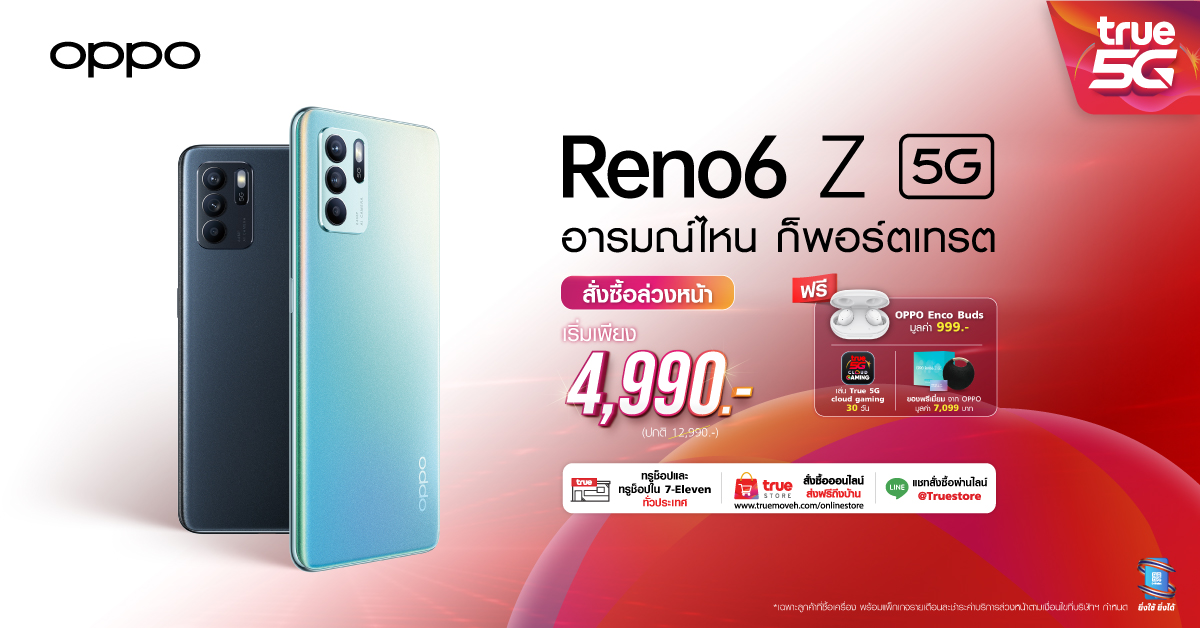 จอง OPPO Reno6 Z 5G พร้อมรับข้อเสนอสุดพิเศษได้ตั้งแต่วันที่ 22 – 29 กรกฎาคม 2564 ที่ทรูช็อปทุกสาขา, ทรูช็อปใน 7-Eleven, ทรูพาร์ทเนอร์ทั่วประเทศ หรือสั่งผ่านช่องทางออนไลน์ส่งฟรีถึงบ้านได้ที่ True Store และ LINE@ True Store https://lin.ee/pLzHHIB สามารถสอบถามรายละเอียดเพิ่มเติมได้ที่ ทรู คอลล์เซ็นเตอร์ 1242 หรือ เว็บไซต์ https://store.truecorp.co.th/online-store/item/L91754183