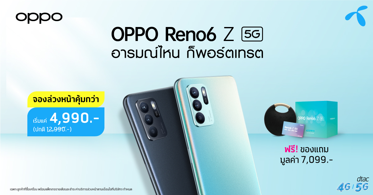พร้อมรับข้อเสนอสุดพิเศษเมื่อจอง OPPO Reno6 Z 5G จากดีแทคได้แล้วที่ศูนย์บริการดีแทคทั่วประเทศ หรือ dtac online store ตั้งแต่วันที่ 22 – 29 กรกฎาคม 2564 และสามารถดูรายละเอียดโปรโมชั่นเพิ่มเติมได้ที่ https://www.dtac.co.th/oppo/oppo-reno6-z-5g
