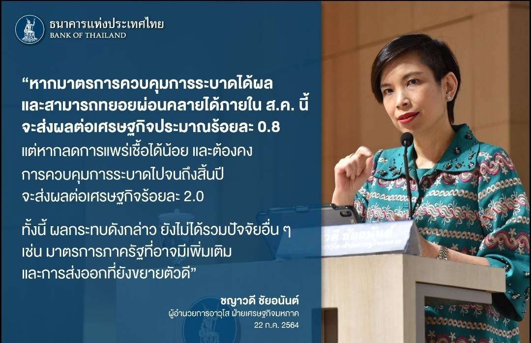 22 กรกฎาคม 2564 : นางสาวชญาวดี ชัยอนันต์ ผู้อำนวยการอาวุโส ฝ่ายเศรษฐกิจมหภาค ธนาคารแห่งประเทศไทย (ธปท.) เปิดเผยว่า จากการประเมินล่าสุดต่อผลกระทบของมาตรการควบคุมการระบาดต่อการขยายตัวทางเศรษฐกิจ หากมาตรการควบคุมการระบาดได้ผล และสามารถทยอยผ่อนคลายได้ภายใน ส.ค. นี้ จะส่งผลต่อเศรษฐกิจประมาณ 0.8% แต่หากลดการแพร่เชื้อได้น้อย และต้องคงการควบคุมการระบาดไปจนถึงสิ้นปี จะส่งผลต่อเศรษฐกิจ 2.0% ทั้งนี้ ผลกระทบดังกล่าว ยังไม่ได้รวมปัจจัยอื่น ๆ ที่สำคัญเช่น มาตรการภาครัฐที่อาจมีเพิ่มเติม และการส่งออกที่ยังขยายตัวดี