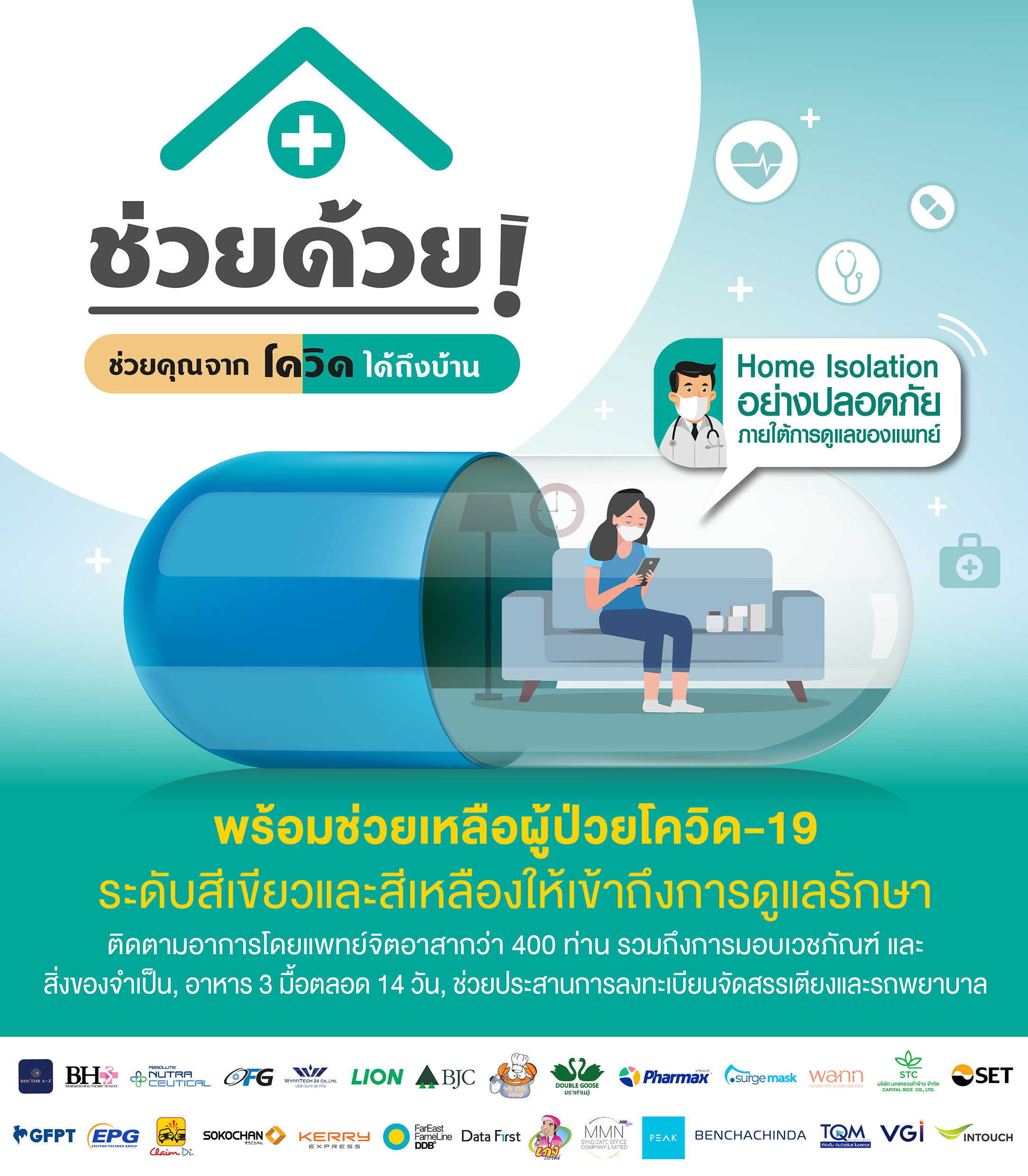 โดยโครงการ ‘ช่วยด้วย! ช่วยคุณจากโควิดได้ถึงบ้าน’ เป็นความร่วมมือกันในการสร้างกลุ่มพันธมิตรโดยภาคบริษัทเอกชน ได้แบ่งทีมเป็น 4 ฝ่าย ในการให้ความช่วยเหลือผู้ป่วยโควิดในด้าน ต่าง ๆ ได้แก่ ทีมดูแลสุขภาพ ให้บริการคำปรึกษาโดยทีมแพทย์จิตอาสากว่า 400 ท่าน และจัดส่งยาให้ในพื้นที่กรุงเทพฯ นนทบุรี และสมุทรปราการ