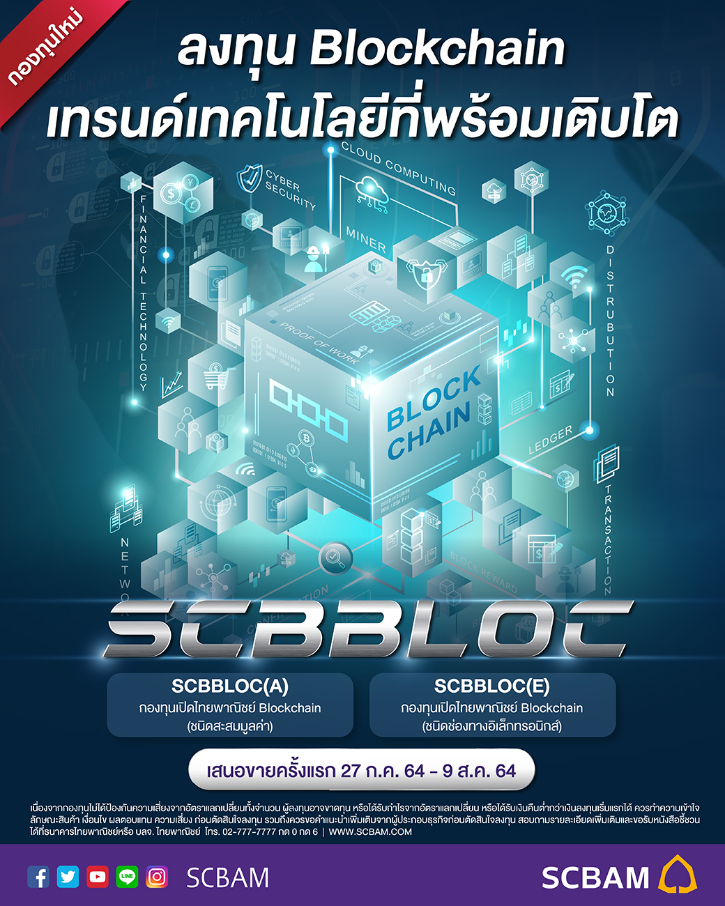 27 กรกฎาคม 2564 : นางนันท์มนัส เปี่ยมทิพย์มนัส ประธานเจ้าหน้าที่บริหารการลงทุน บริษัทหลักทรัพย์จัดการกองทุน ไทยพาณิชย์ จำกัด เปิดเผยว่า บริษัทฯ มองว่าเทคโนโลยี Blockchain กำลังอยู่ในช่วงเติบโต มีการนำไปใช้อย่างแพร่หลายในหลากหลายอุตสาหกรรม และนักลงทุนก็ให้ความสนใจกับการลงทุนใน Technology Blockchain มากขึ้น จึงได้เปิดเสนอขาย กองทุนเปิดไทยพาณิชย์ Blockchain (SCB Blockchain : SCBBLOC) มูลค่าโครงการ 1,000 ล้านบาท
