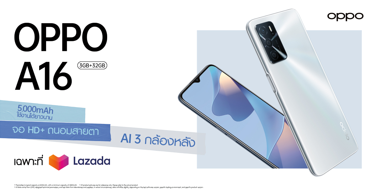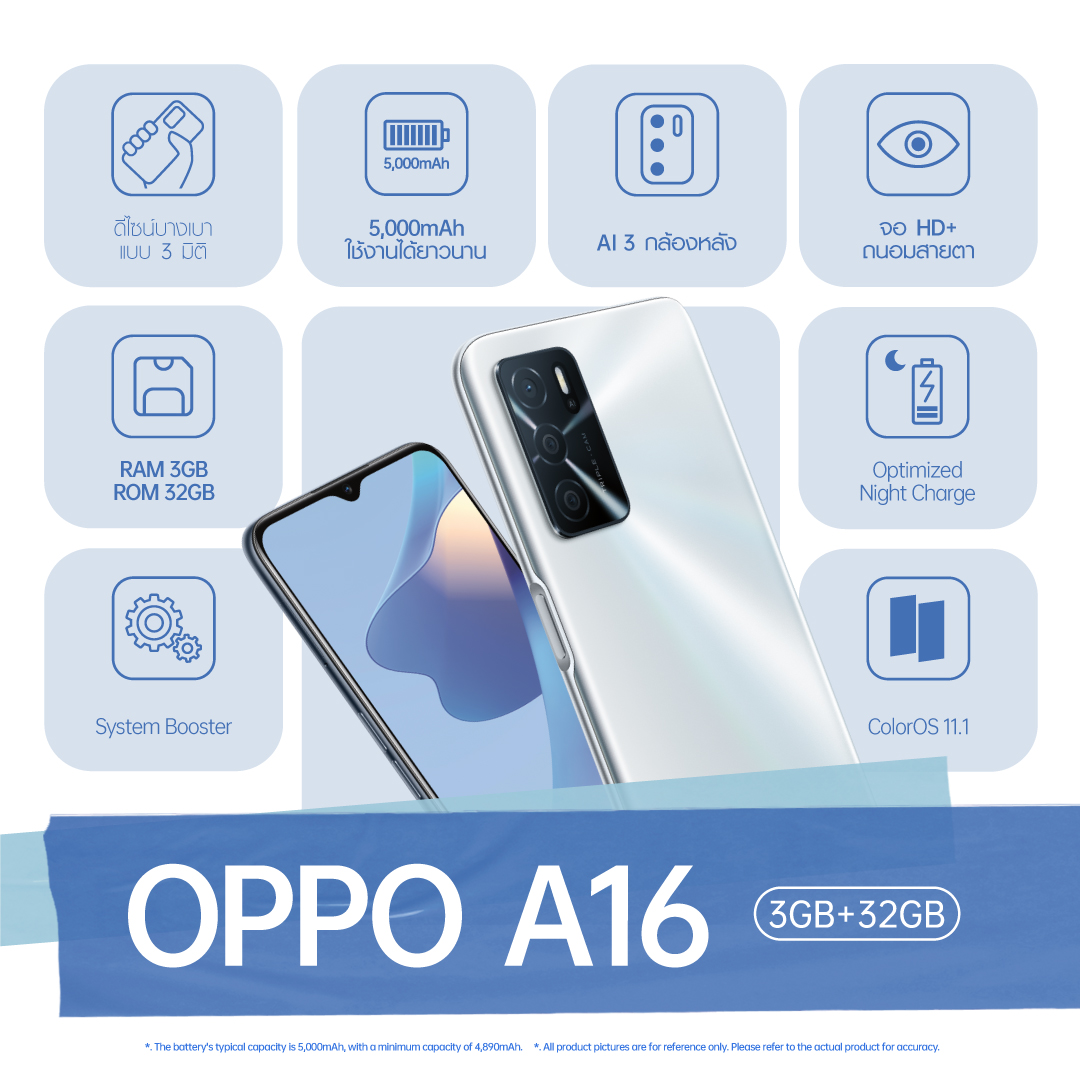 โดย OPPO A16 รุ่น RAM 3GB + ROM 32GB พร้อมมอบความบันเทิงได้ตลอดทั้งวัน ด้วยแบตเตอรี่ที่มีมากถึง 5,000 mAh, หน้าจอ HD+ คมชัดถนอมสายตา และ AI 3 กล้องหลังให้คุณถ่ายภาพสนุกในทุกช็อต รวมถึงมีดีไซน์สวยงามบางเบาแบบ 3 มิติ พร้อมให้คุณจับจองเป็นเจ้าของด้วยข้อเสนอสุดพิเศษ[1] ดังนี้