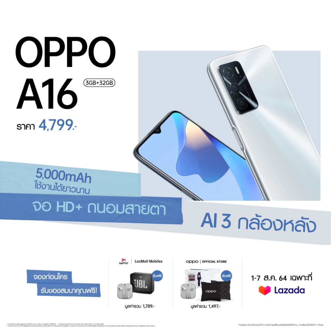 สำหรับใครที่กำลังมองหาสมาร์ทโฟนแบตอึด จอชัด พร้อมถ่ายภาพสนุกด้วย AI 3 กล้องหลัง ห้ามพลาด! OPPO A16 รุ่น RAM 3GB + ROM 32GB โดยสามารถจองได้แล้วตั้งแต่วันที่ 1-7 สิงหาคม 2564 พร้อมรับส่วนลดหรือของสมนาคุณมากมายที่ LazMall Mobiles หรือ OPPO Official Store บน Lazada เท่านั้น