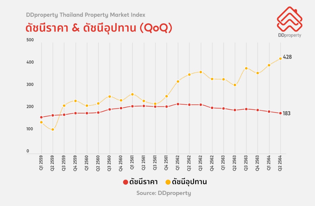 “แม้ดัชนีความเชื่อมั่นผู้บริโภคโดยรวมในเดือนมิถุนายน 2564 จะปรับตัวเพิ่มขึ้นมาอยู่ที่ระดับ 42.7 จากระดับ 41.6 ในเดือนก่อนหน้า แต่ถือว่าผู้บริโภคยังไม่เชื่อมั่นกับภาวะเศรษฐกิจ จึงยังคงวางแผนการเงินอย่างรัดกุมและใช้เวลาในการตัดสินใจซื้อที่อยู่อาศัยนานขึ้น แนวโน้มดัชนีราคาที่อยู่อาศัยทุกประเภทลดลงต่อเนื่อง และคาดว่าจะไม่ปรับตัวเพิ่มขึ้นในปีนี้ ในขณะที่ดัชนีอุปทานเพิ่มขึ้นจากไตรมาสก่อนถึง 7% โครงการอสังหาฯ สะท้อนให้เห็นว่ายังคงมีสินค้าคงค้างอยู่ในตลาดอีกพอสมควร โดยเฉพาะคอนโดฯ