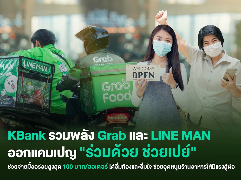 “ร่วมด้วย ช่วยเปย์” คุณช่วยสั่ง เราช่วยจ่าย สั่งอาหารผ่าน Grab หรือ LINE MAN จ่ายผ่านบัตรเดบิต/บัตรเครดิตกสิกรไทย, บัตรเดบิต LINE BK หรือ GrabPay Wallet ใส่โค้ด: KBANK กสิกรไทยช่วยจ่ายมื้ออร่อยให้สูงสุด 100 บาท/ออเดอร์ เมื่อสั่งขั้นต่ำ 100 บาท/ออเดอร์ จำกัดท่านละ 2 สิทธิ์ต่อแอปพลิเคชัน ตลอดแคมเปญ สิทธิ์มีจำนวนจำกัดต่อวัน