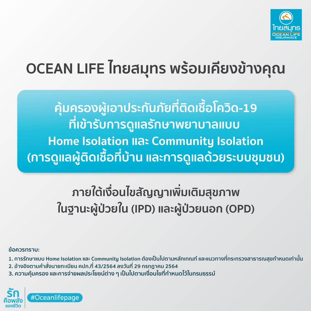 ดังนั้น เพื่อบรรเทาความเดือดร้อนของประชาชน และเพื่อช่วยแบ่งเบาภาระของภาครัฐและบุคลากรทางการแพทย์ จึงได้เพิ่มความอุ่นใจอีกระดับด้วยความคุ้มครองลูกค้าภายใต้เงื่อนไขสัญญาเพิ่มเติมสุขภาพ ในฐานะผู้ป่วยใน (IPD) และผู้ป่วยนอก (OPD) กรณีที่ผู้เอาประกันภัยเข้ารับการดูแลและรักษาจากโรคติดเชื้อไวรัส COVID-19 แบบ Home Isolation และ Community Isolation ซึ่งความคุ้มครองเป็นไปตามคำสั่งนายทะเบียน สำนักงานคณะกรรมการกำกับและส่งเสริมการประกอบธุรกิจประกันภัย (คปภ.) นอกเหนือจากการให้ความคุ้มครองกรณีเข้ารับการรักษาในโรงพยาบาลสนาม (FIELD HOSPITAL) และหอผู้ป่วยเฉพาะกิจ (HOSPITEL)